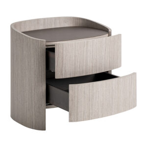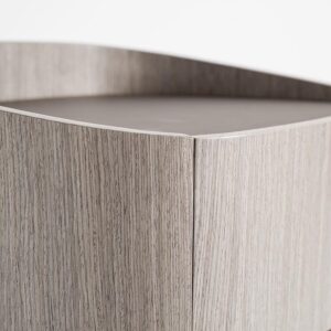 Mesita de noche Burkina de estilo contemporáneo fabricado en madera contrachapada en color gris combinado con chapa de roble en color gris y cuero en color gris.