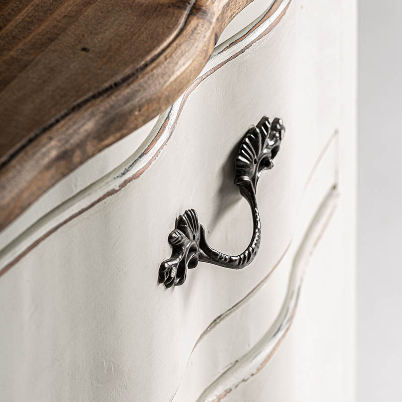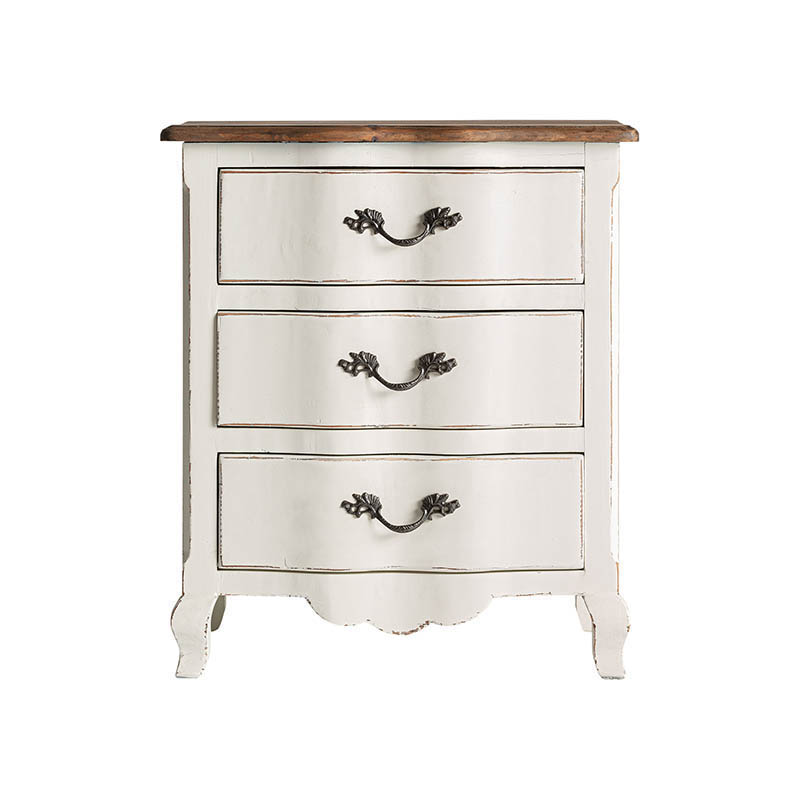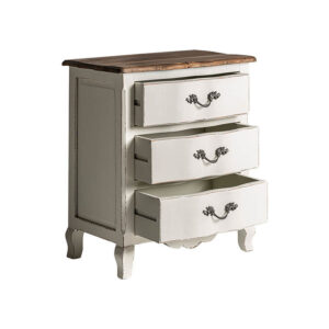 Mesita de noche Pivka de estilo provenzal fabricado en madera de pino reciclado en color blanco roto.