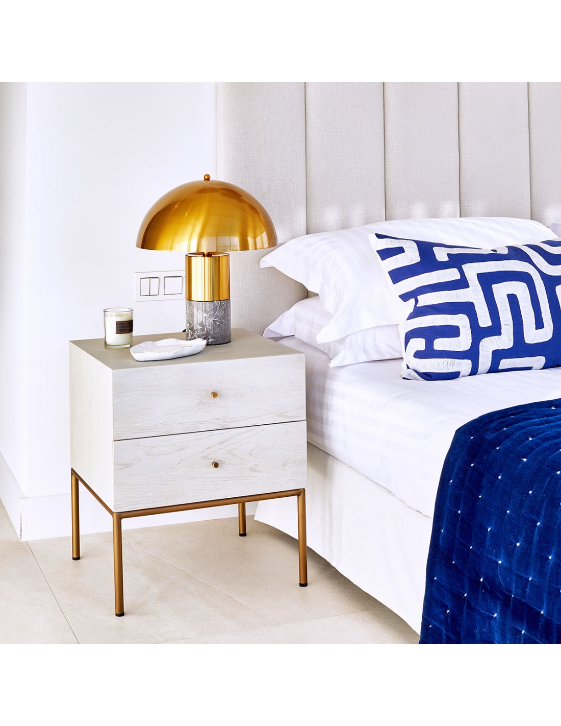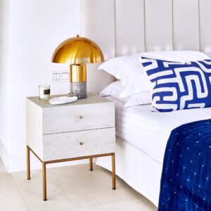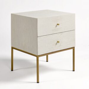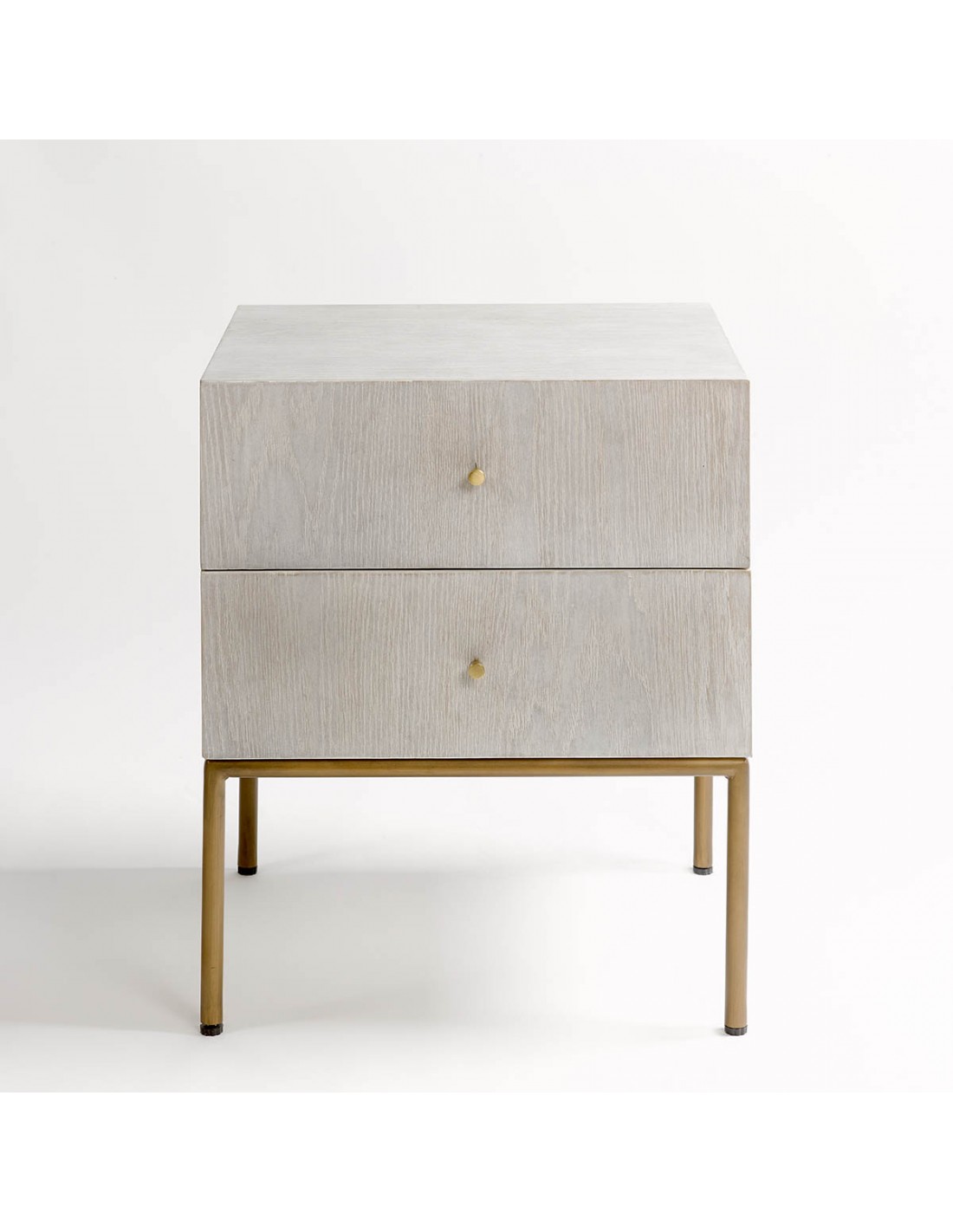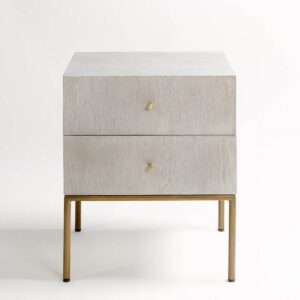 Mesita de noche con acabado de roble en tono blanco grisáceo patinado. Pata estructura metálica en color dorado envejecido. Cuenta con dos cajones para mayor almacenaje. Mesita de noche de diseño con líneas rectas y minimalista.