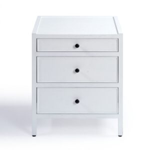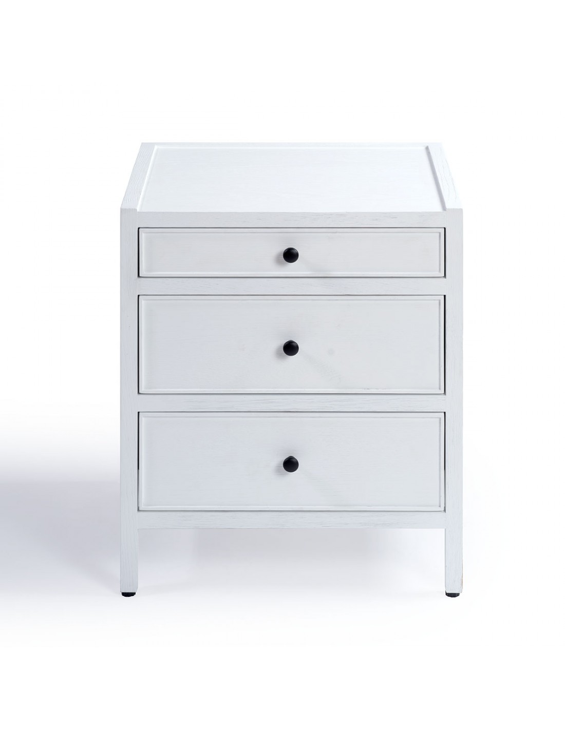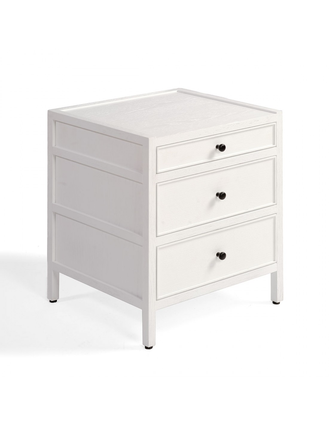 Mesita de noche acabada en roble blanco con tres cajones. Su diseño sencillo y con capacidad de almacenaje la hacen una mesita ideal para tu dormitorio. Gracias a sus materiales también le aporta calidez. Disponible en otras medidas y acabados.