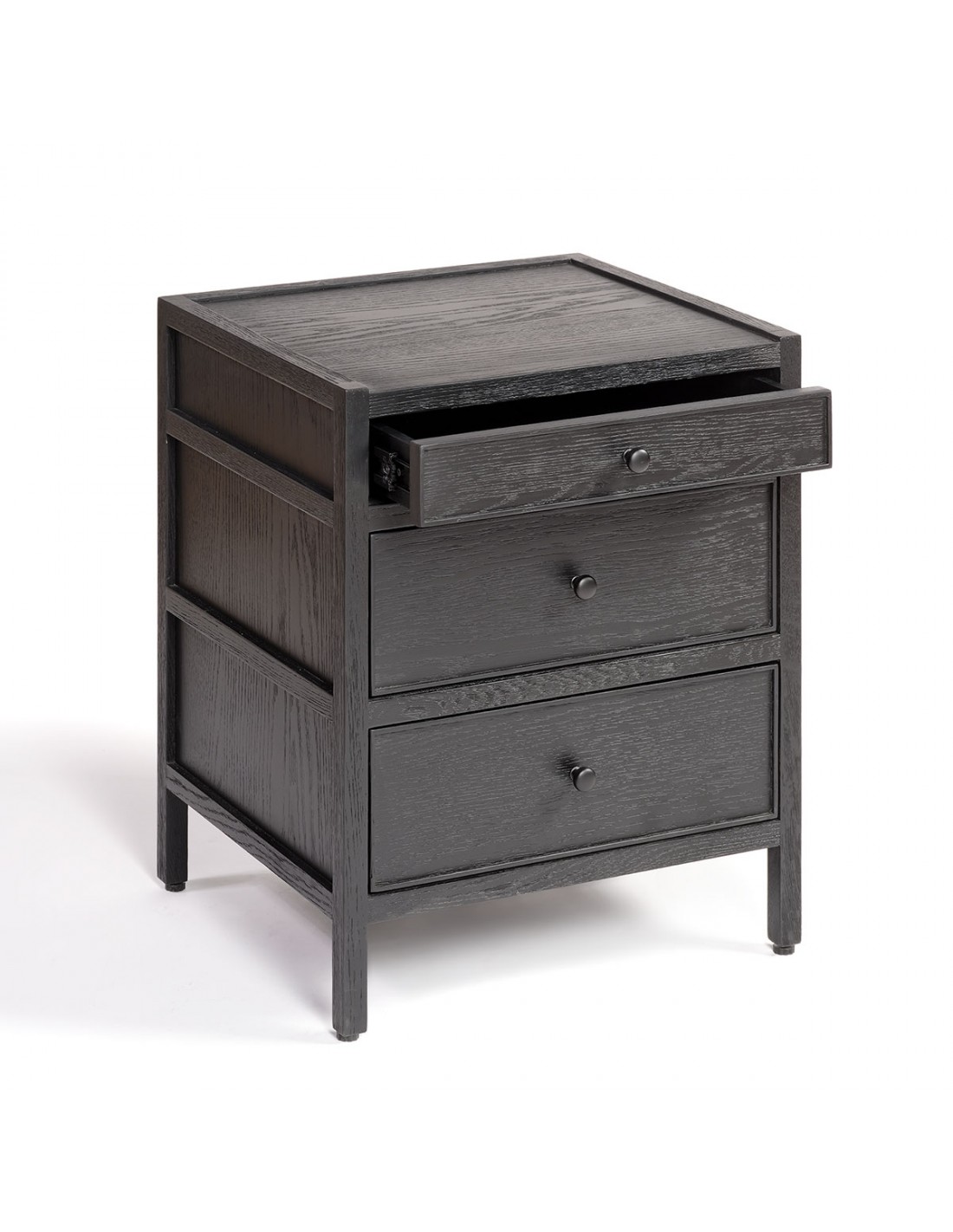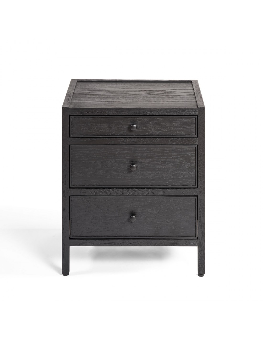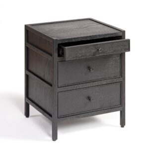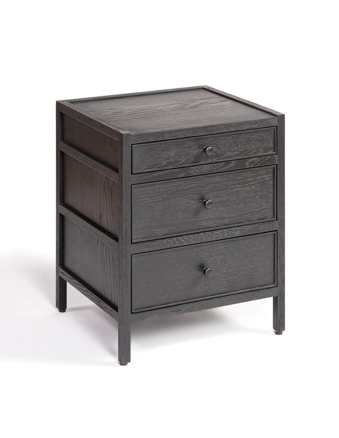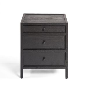 Mesita de noche acabada en roble negro con tres cajones. Su diseño sencillo y con capacidad de almacenaje la hacen una mesita ideal para tu dormitorio. Gracias a sus materiales también le aporta calidez. Disponible en otras medidas y acabados.