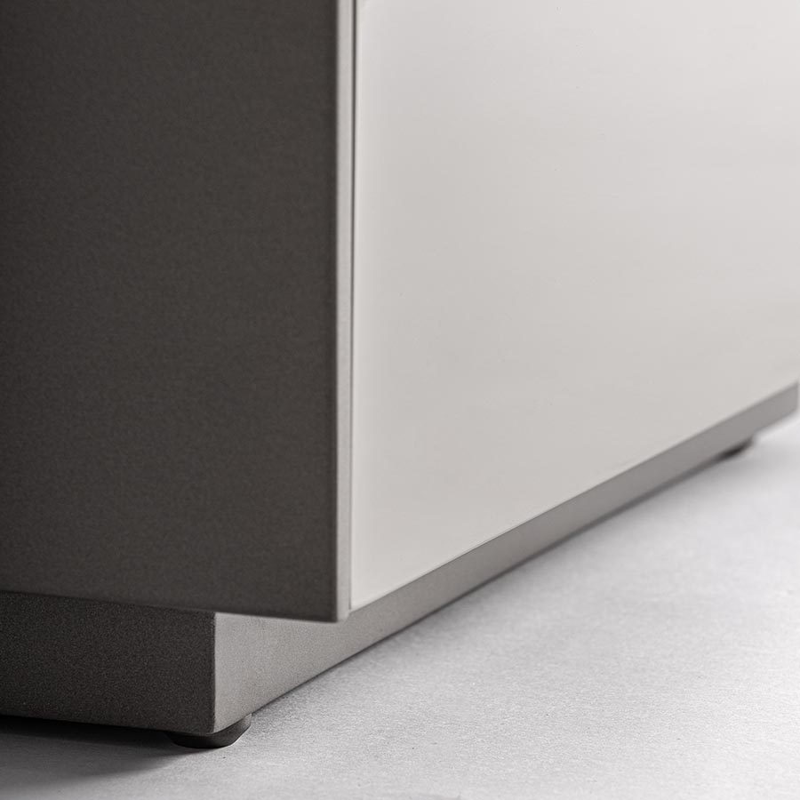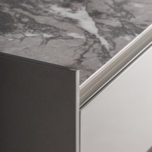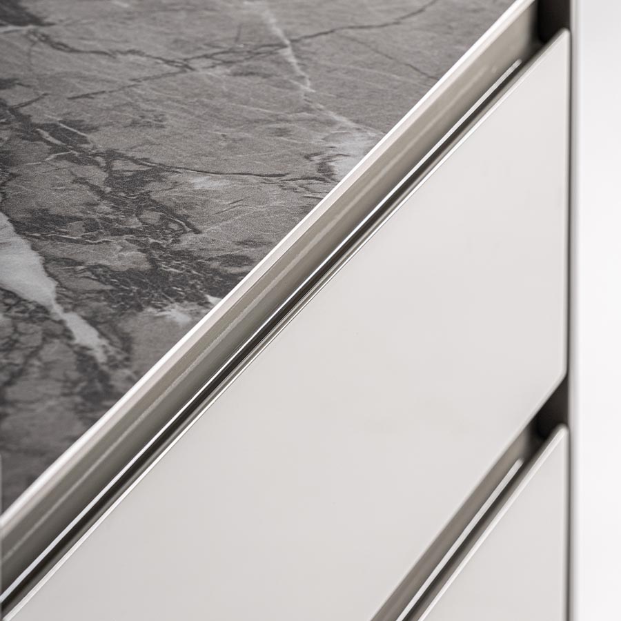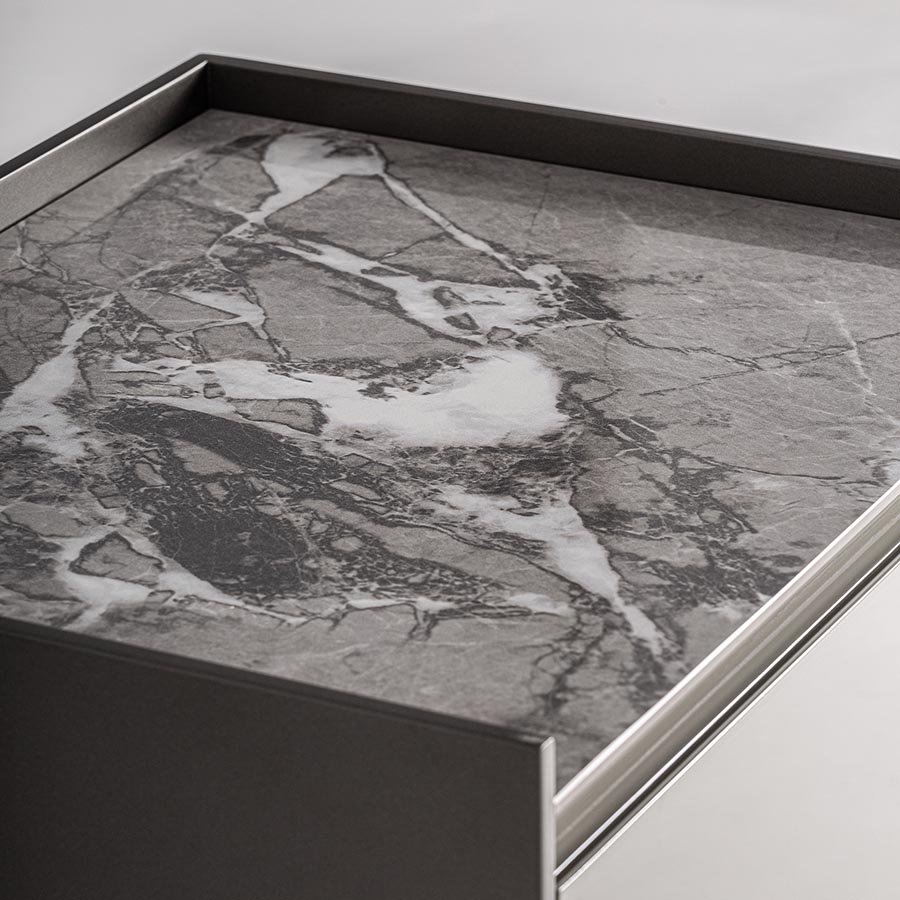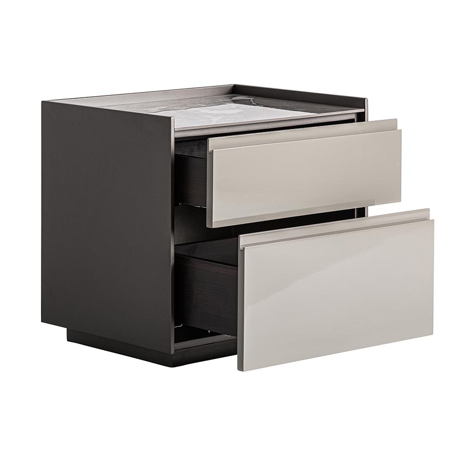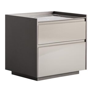 Mesita de noche Rotwell de estilo art deco fabricado en madera dm en color gris combinado con piedra sinterizada en color tonos oscuros.