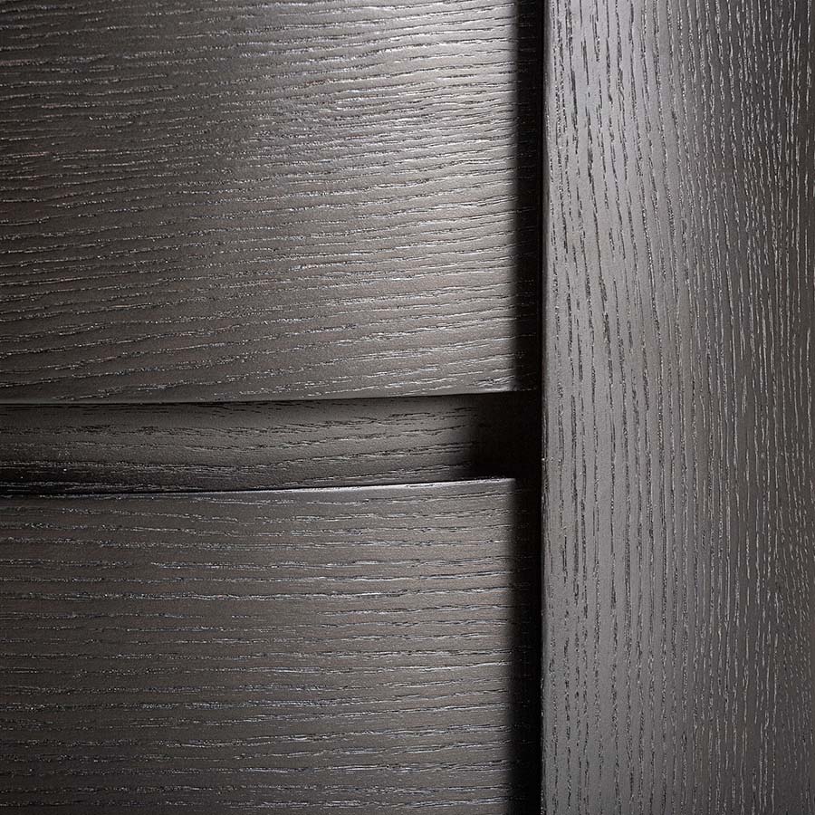 Mesita de noche oval zofingen de estilo art deco fabricado en madera contrachapada en color negra combinado con chapa de roble en color negra y piedra sinterizada en color blanco.