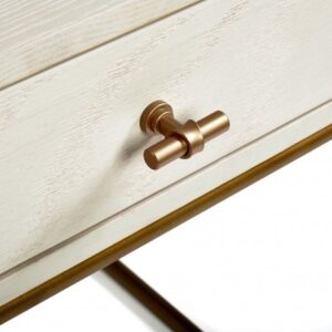 Mesita de noche acabada en madera de roble blanco grisáceo patinado. Estrucutra metálica en tubo redondo color dorado. Tirado en forma de T de diseño moderno para dar un toque actual y sofisticado a la pieza. Una mesita de noche con líneas rectas y aire contemporáneo.