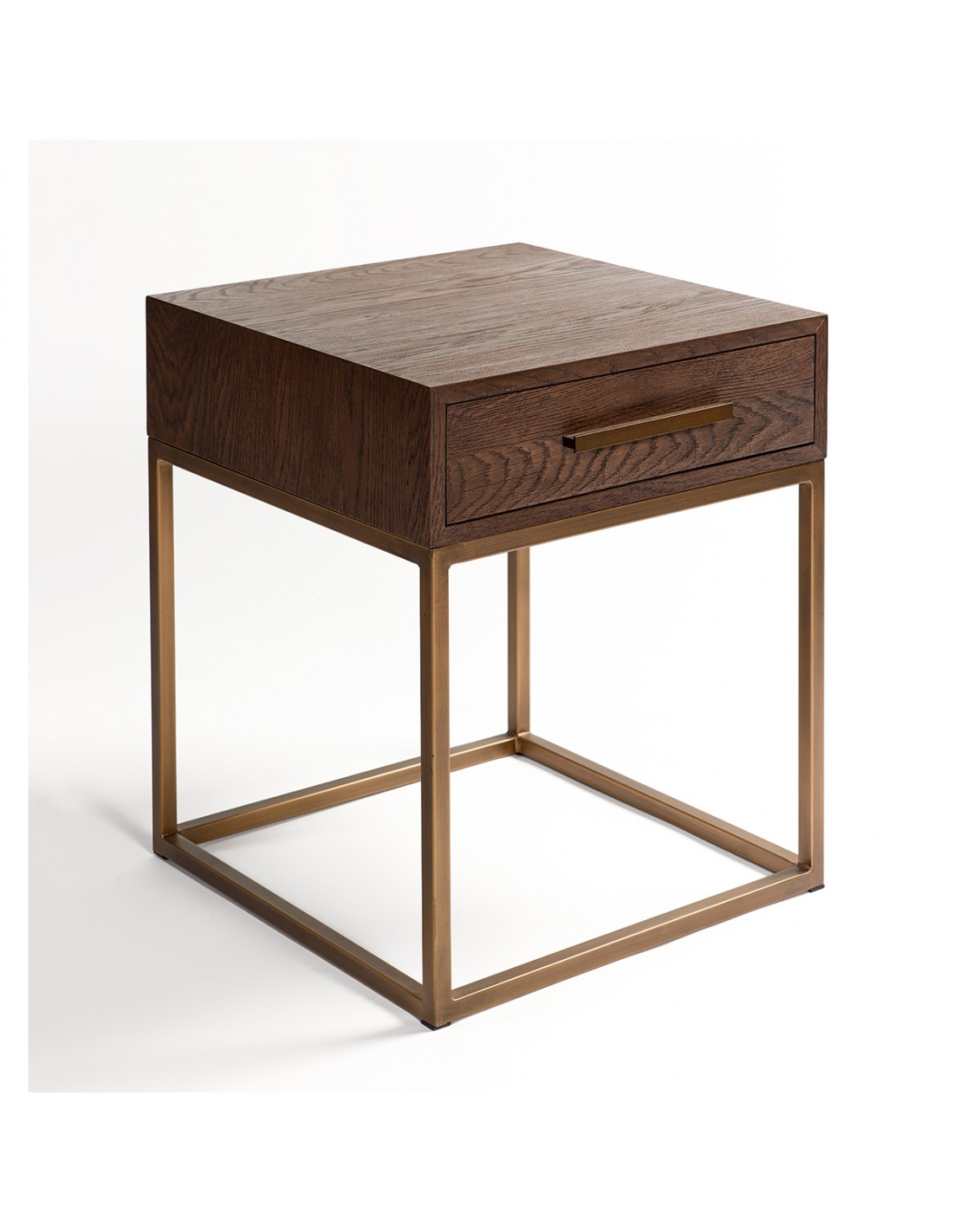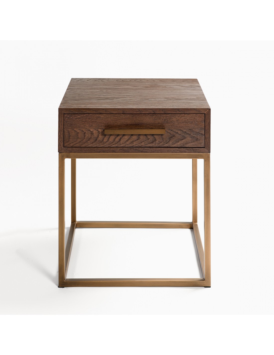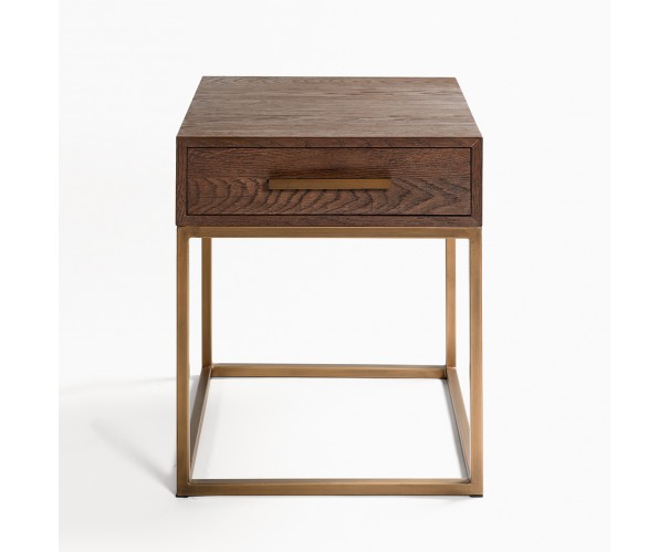 Esta mesilla de madera de roble, base metálica y tirador en color dorado de líneas rectas le aportará a tu dormitorio o salón un toque sofisticado. De pequeñas dimensiones, es un mueble auxiliar de gran versatilidad en el que podrás mantener en orden tus objetos personales con la cajonera que contiene. ¡Disfruta de tu hogar, sin renunciar al estilo más chic!