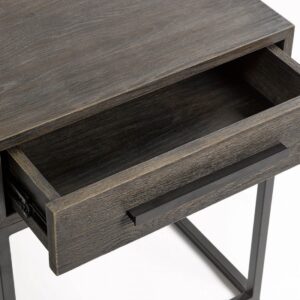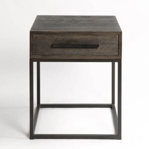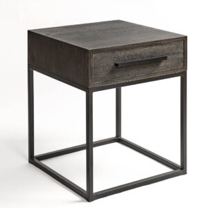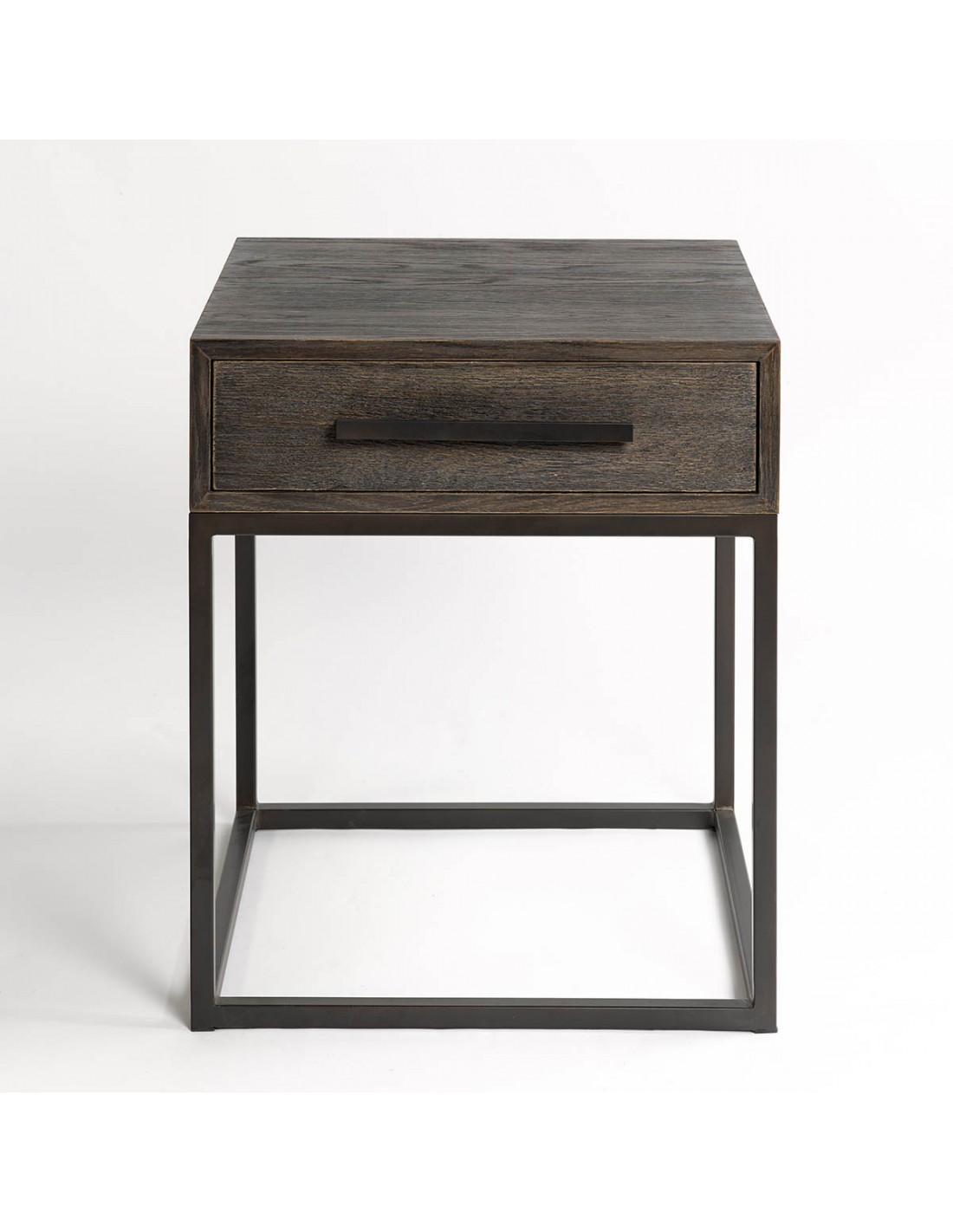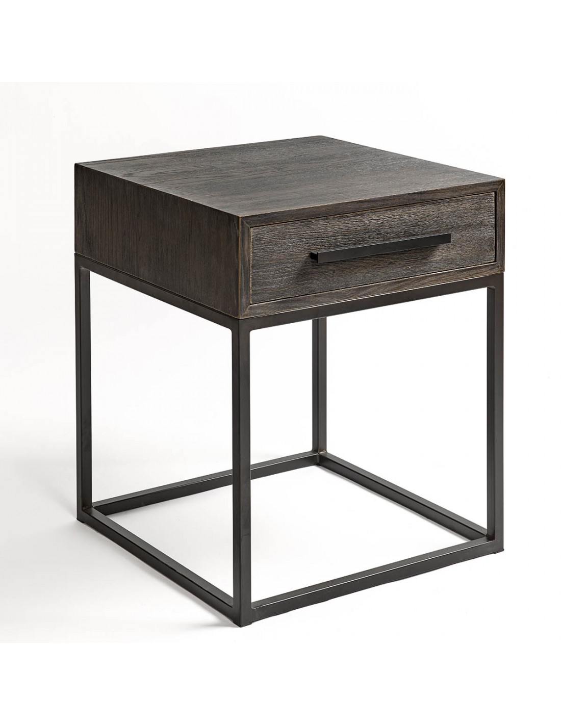 Mesita de noche acabado en roble grisáceo y metal café oscuro. Cuenta con un cajón y líneas rectas muy depuradas consiguiendo un diseño moderno y minimalista.