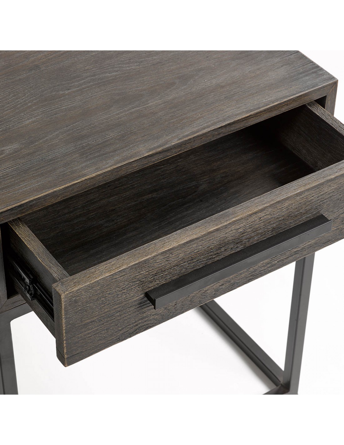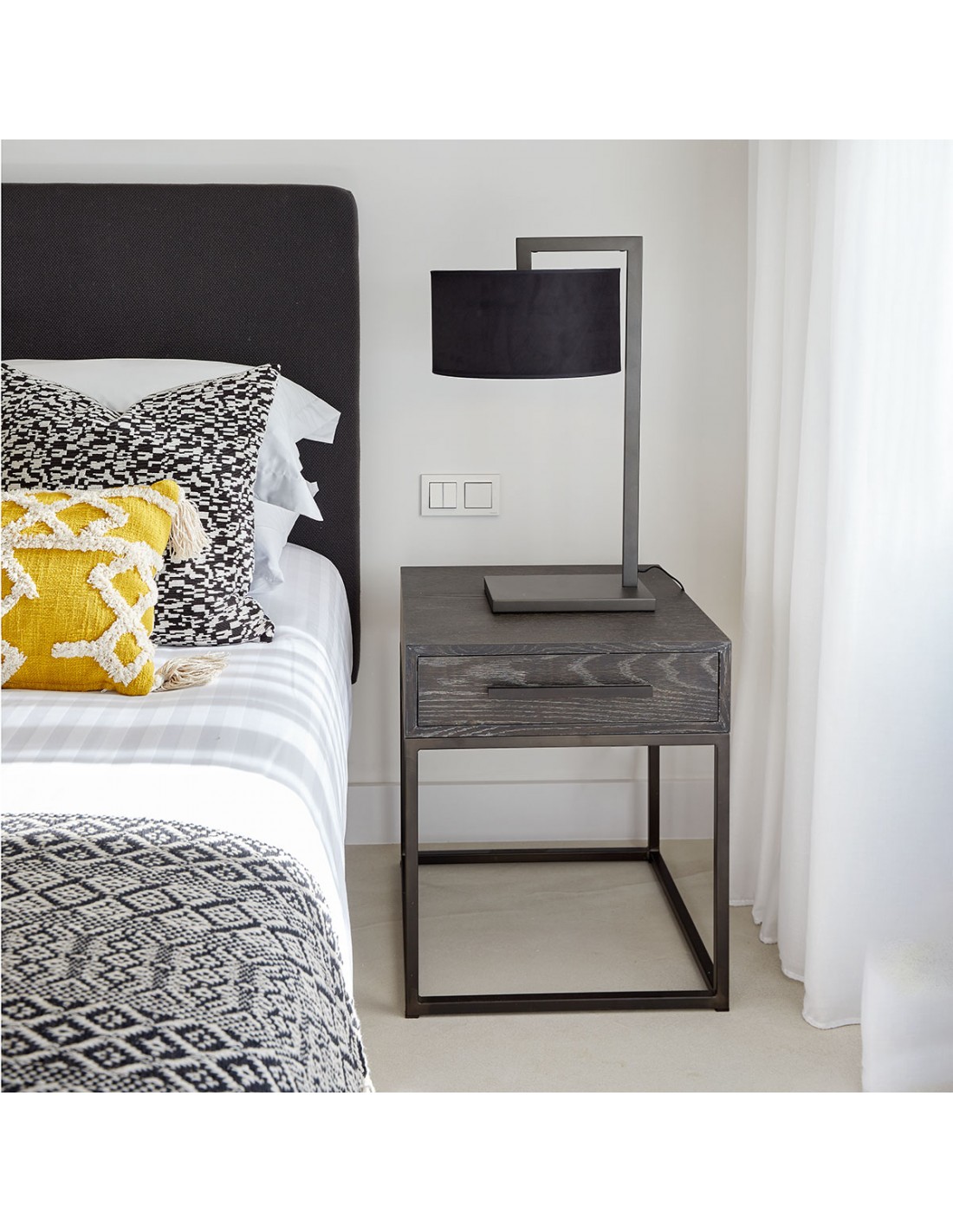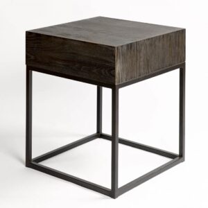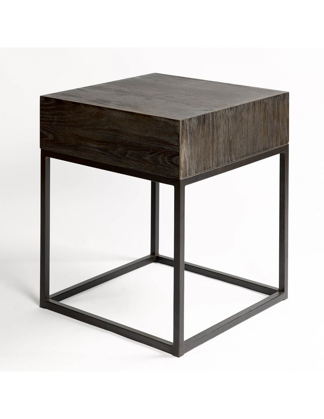 Mesita de noche acabado en roble grisáceo y metal café oscuro. Cuenta con un cajón y líneas rectas muy depuradas consiguiendo un diseño moderno y minimalista.