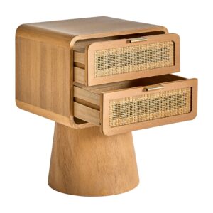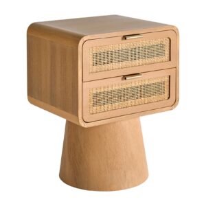 Con una atractiva base cilíndrica que sujeta una estructura rectangular formada por dos cajones de ratán, la mesita Sneek llega para vestir tus rinconces más acogedores. Formada por madera de pino y ratán, se compone de dos cajones para guardar tus piezas de ropa más pequeñas. Este mueble de habitación resulta ideal para combinar con muebles de estilo nórdico.