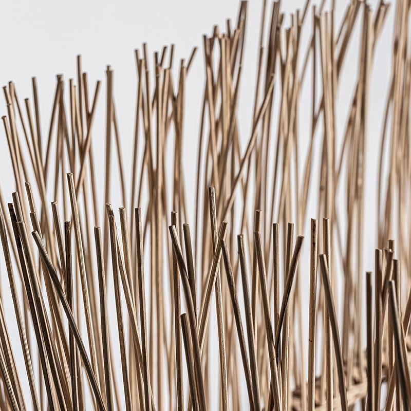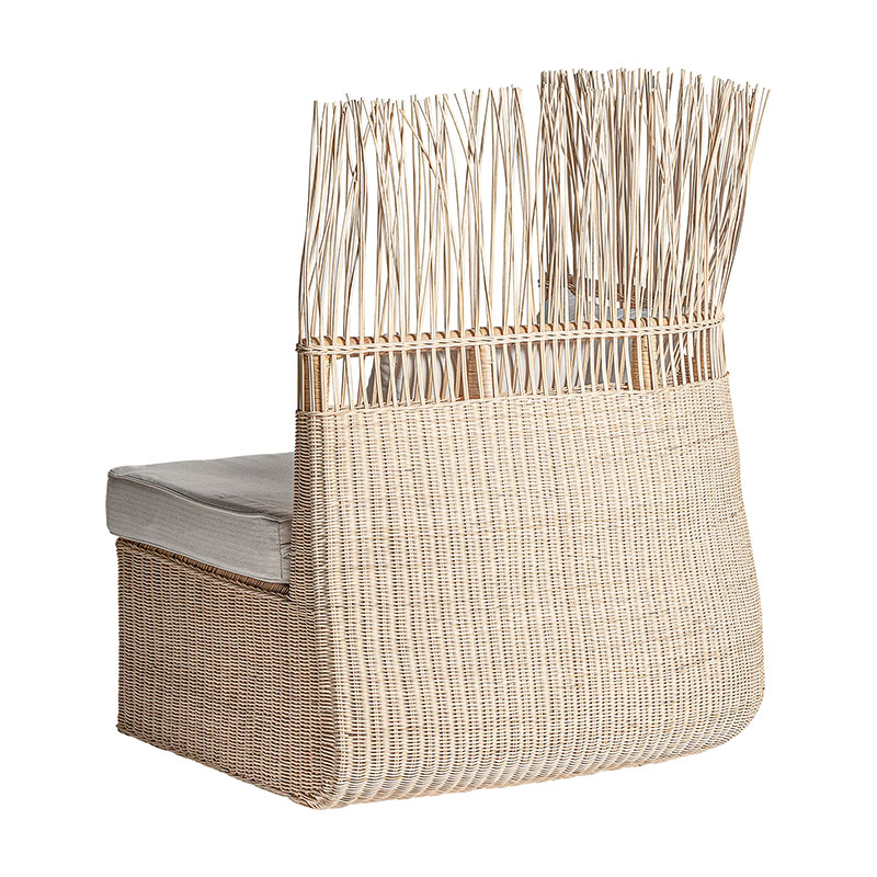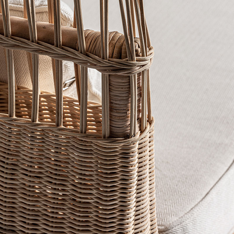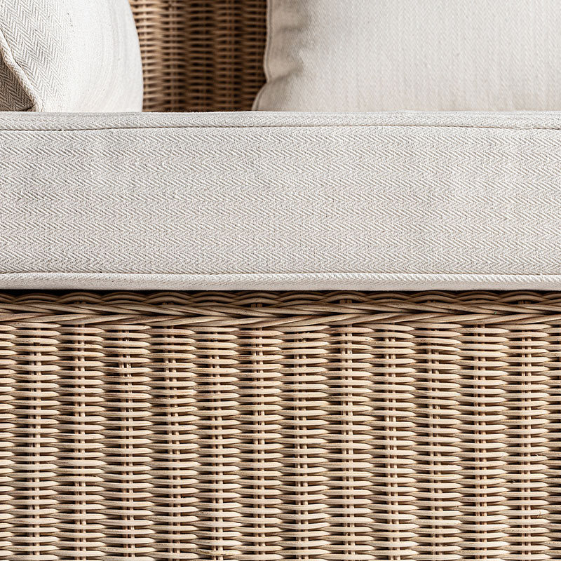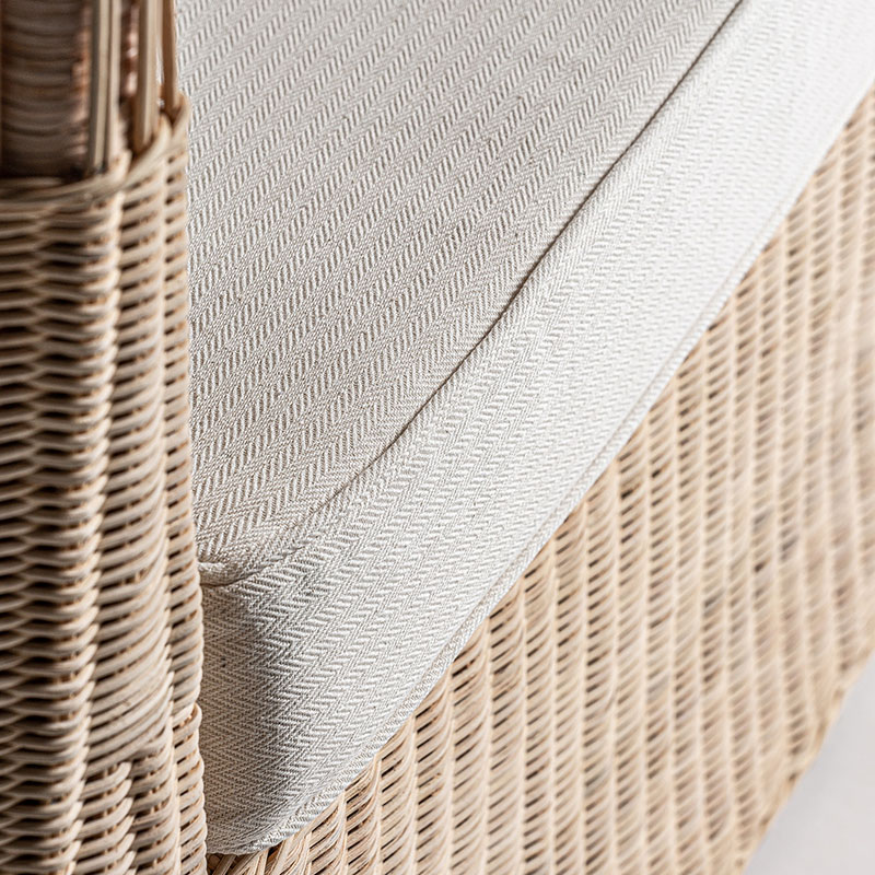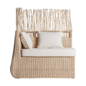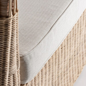 Módulo sofá esquinero Roche de estilo étnico fabricado en ratán en color marrón combinado con algodón en color blanco con acabado liso.