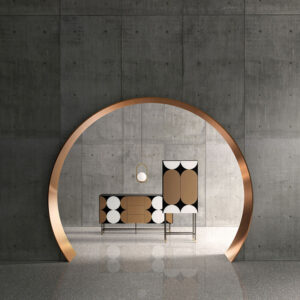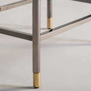 Mueble bar kraj de estilo art deco fabricado en hierro en color marrón combinado con madera de mango en color oro.
