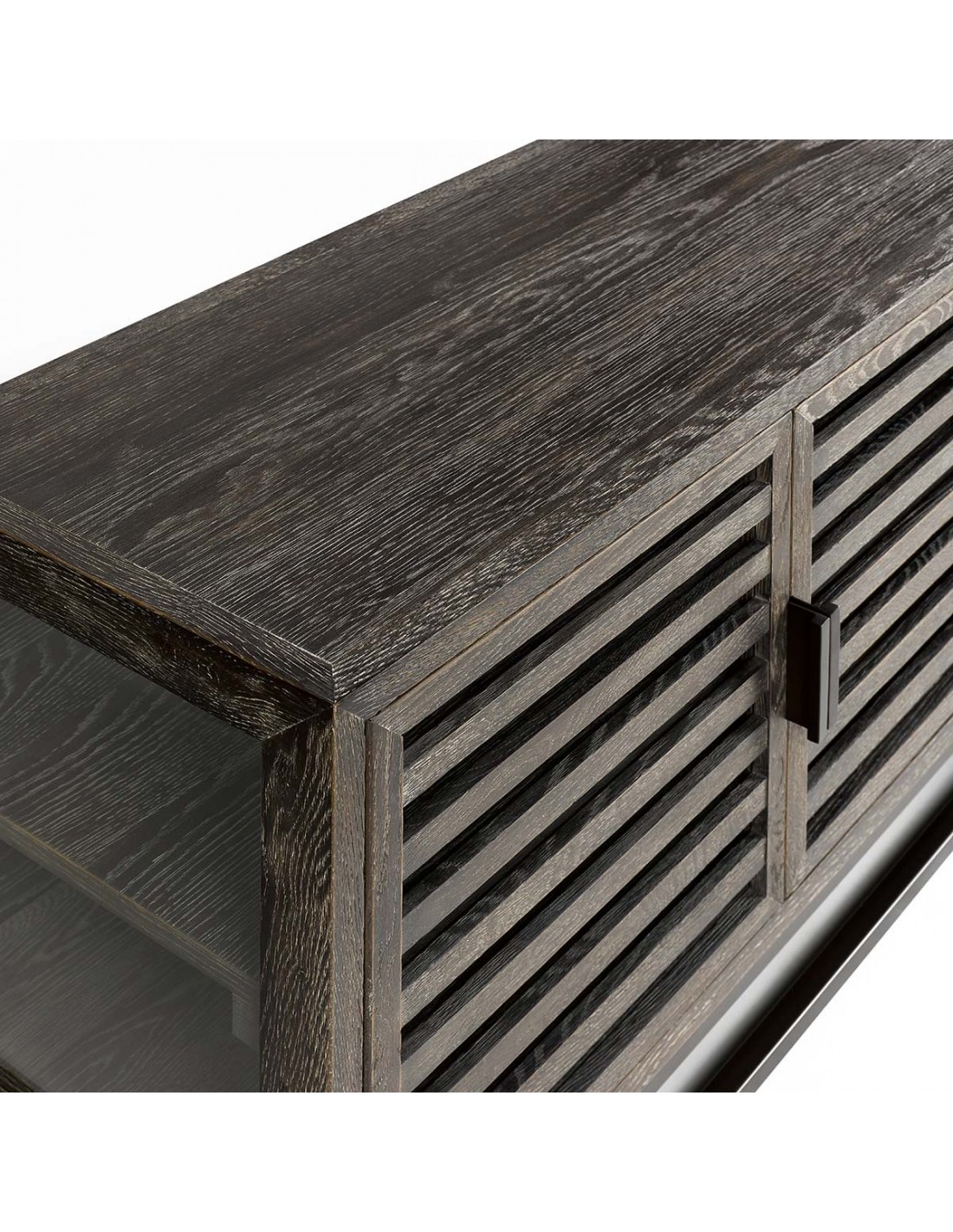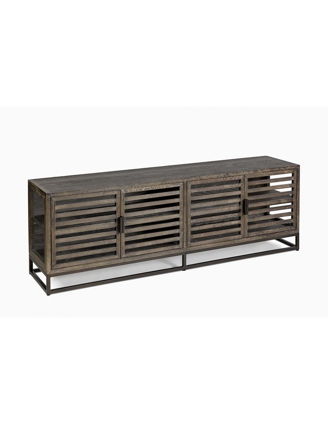 Un mueble de T.V. madera de roble grisáceo, patas metálicas y tiradores del mismo material y laterales y puertas frontales acristaladas. Destaca por la simplicidad de su diseño, de líneas rectas y depuradas. Tiene cuatro puertas y una balda interior, que divide el amplio espacio interior en dos zonas, para que puedas guardar fácilmente tus películas y libros favoritos. Este modelo te sorprenderá por la maravillosa combinación de materiales: madera, cristal y metal.