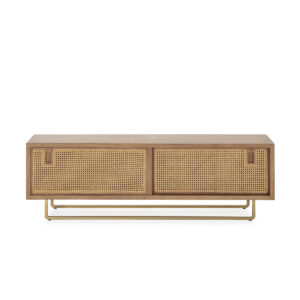 Mueble tv beckley de estilo nórdico fabricado en madera de mango en color marrón y mimbre. Producto desmontable.