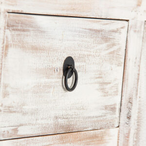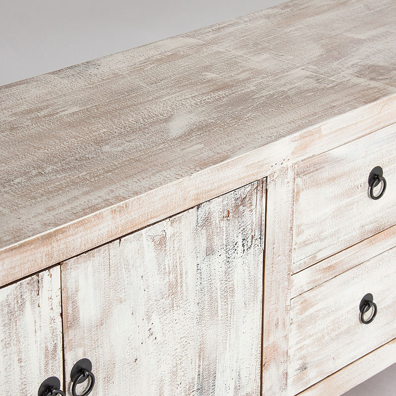 Mueble tv Baratti de estilo provenzal fabricado en madera de pino reciclado en color blanco roto con acabado decapado.
