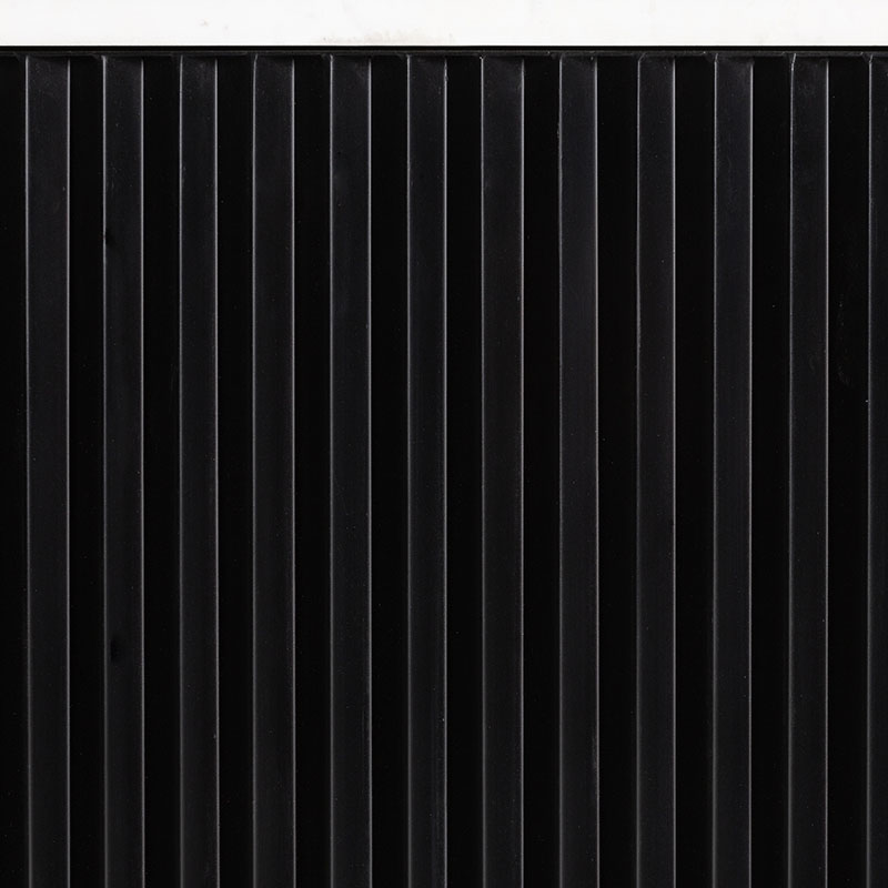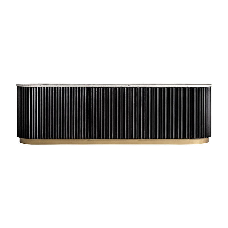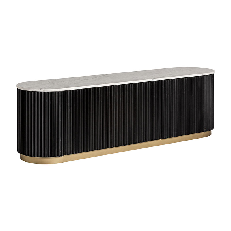 Mueble tv bettingen de estilo art deco fabricado en mármol en color negro combinado con hierro en color blanco y madera dm en color oro.