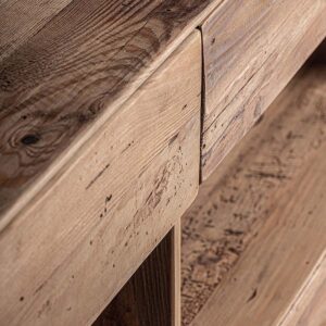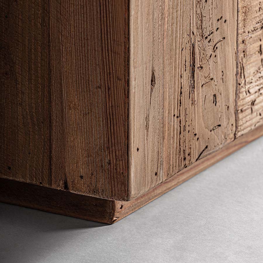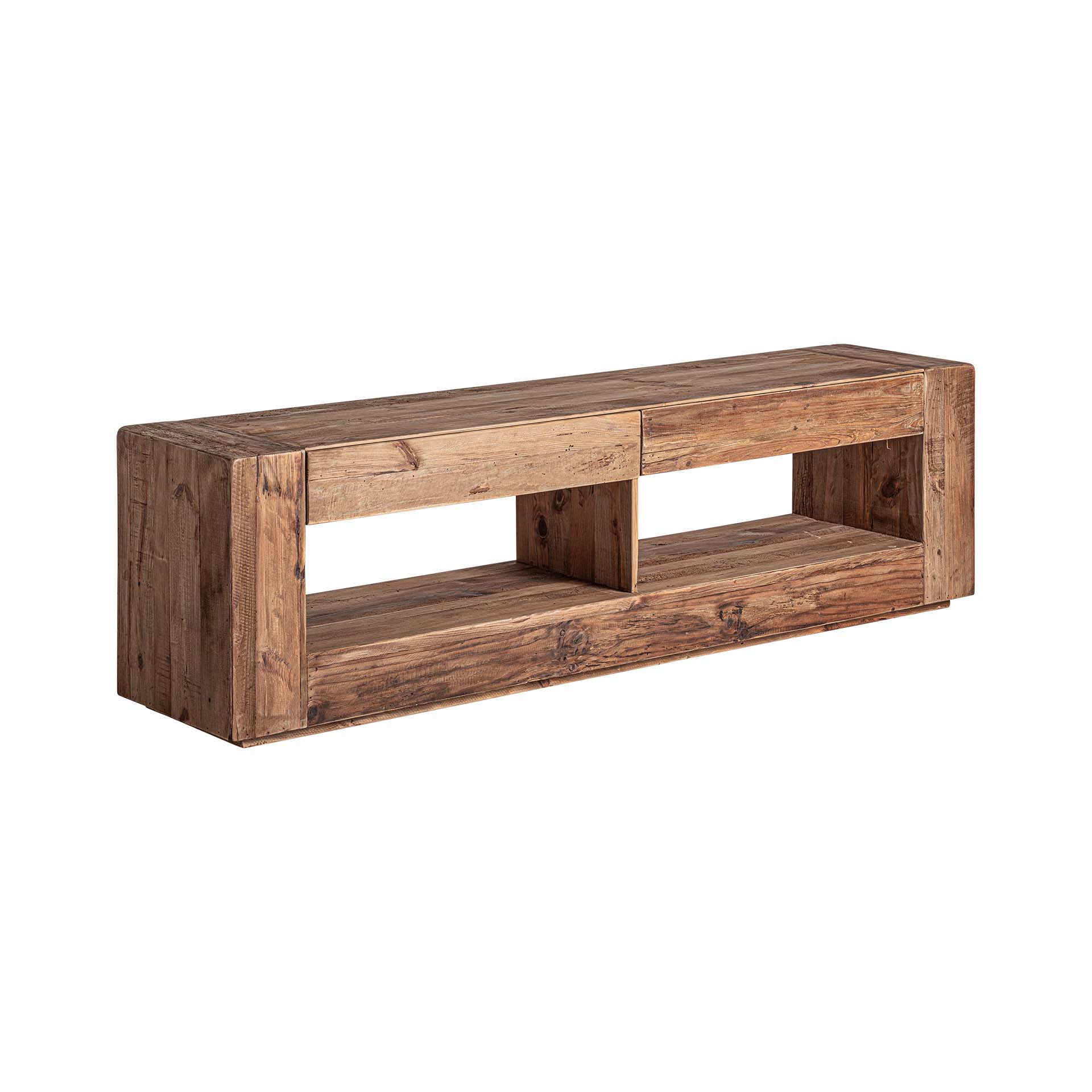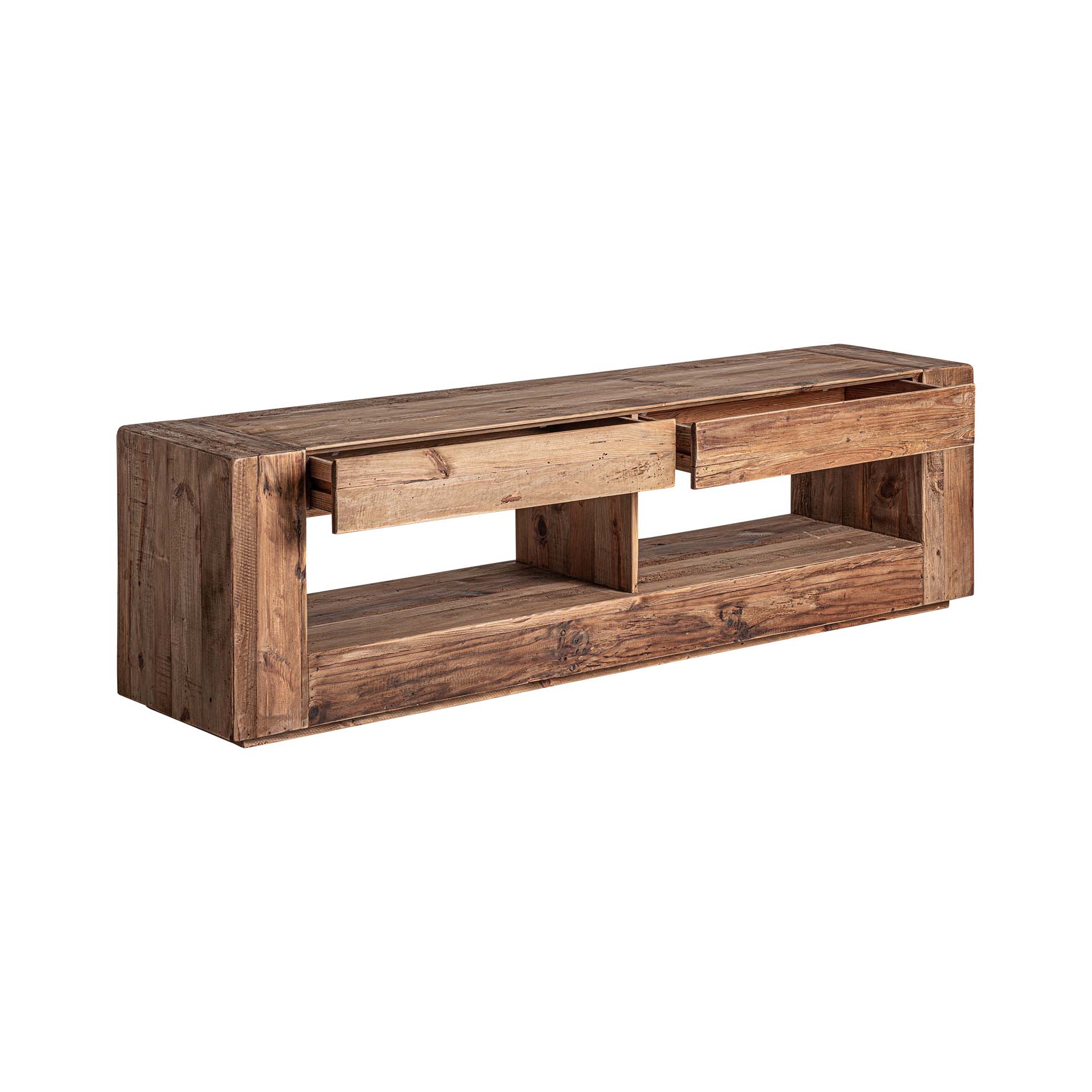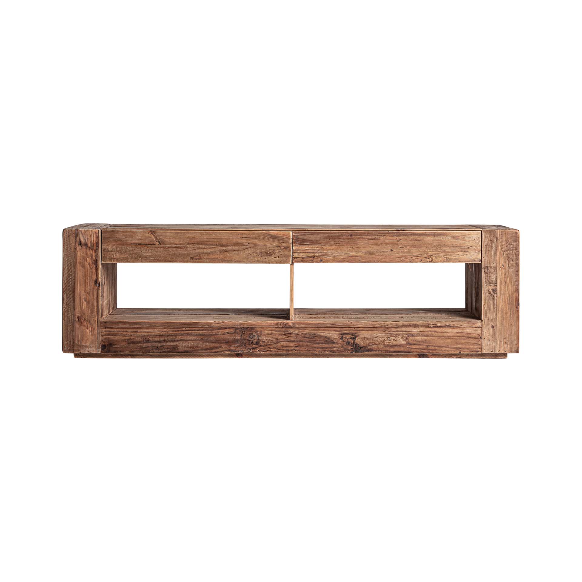 Mueble tv breive de estilo rústico fabricado en madera de pino reciclado en color marrón con acabado envejecido.