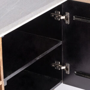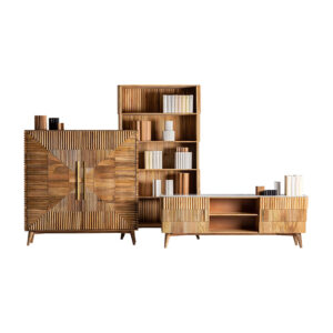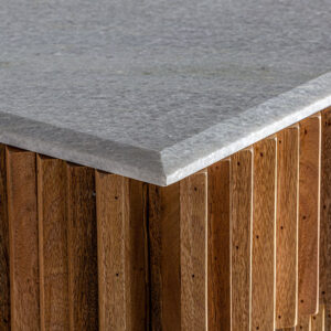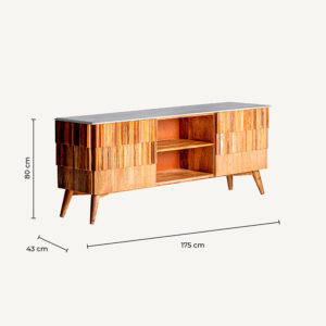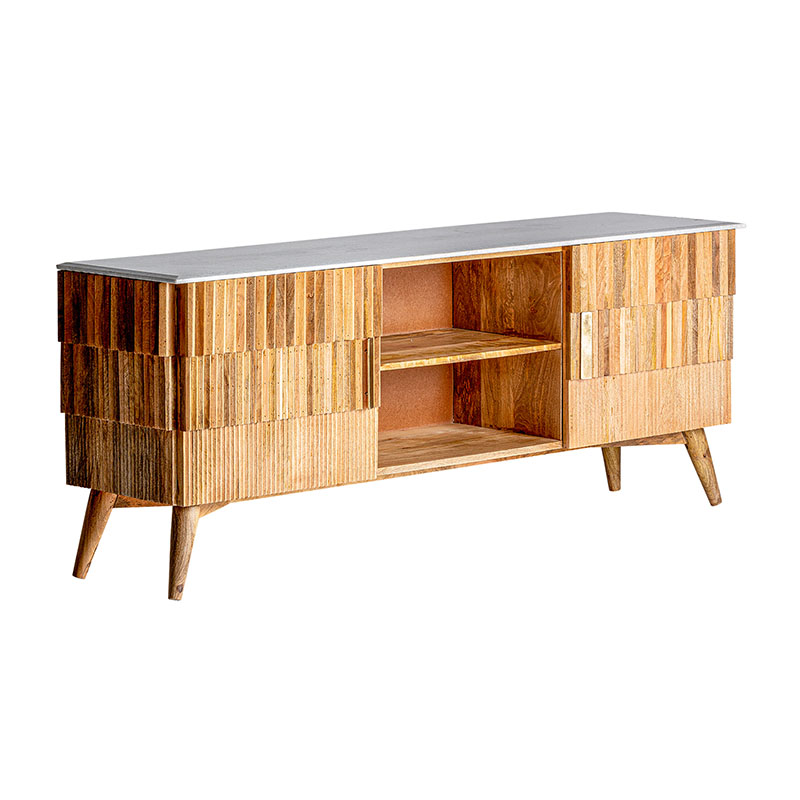 Mueble tv plissé wood, en color marrón, de estilo art deco. Fabricado en madera de mango, combinado con mármol y hierro. Producto desmontable.