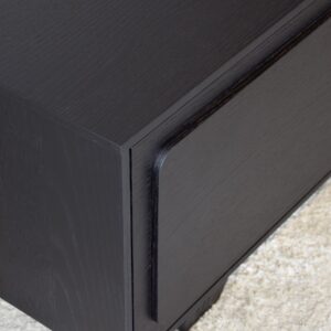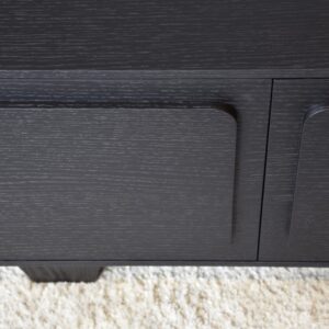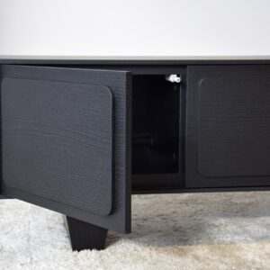 MUEBLE TV RÍO. REALIZADO EN TABLERO DM RECHAPADO EN ROBLE NATURAL TEÑIDO EN COLOR NEGRO DE ACABADO MATE. 4 PUERTAS CON SISTEMA DE APERTURA «PUSH».