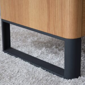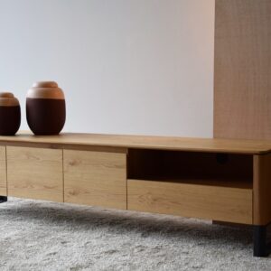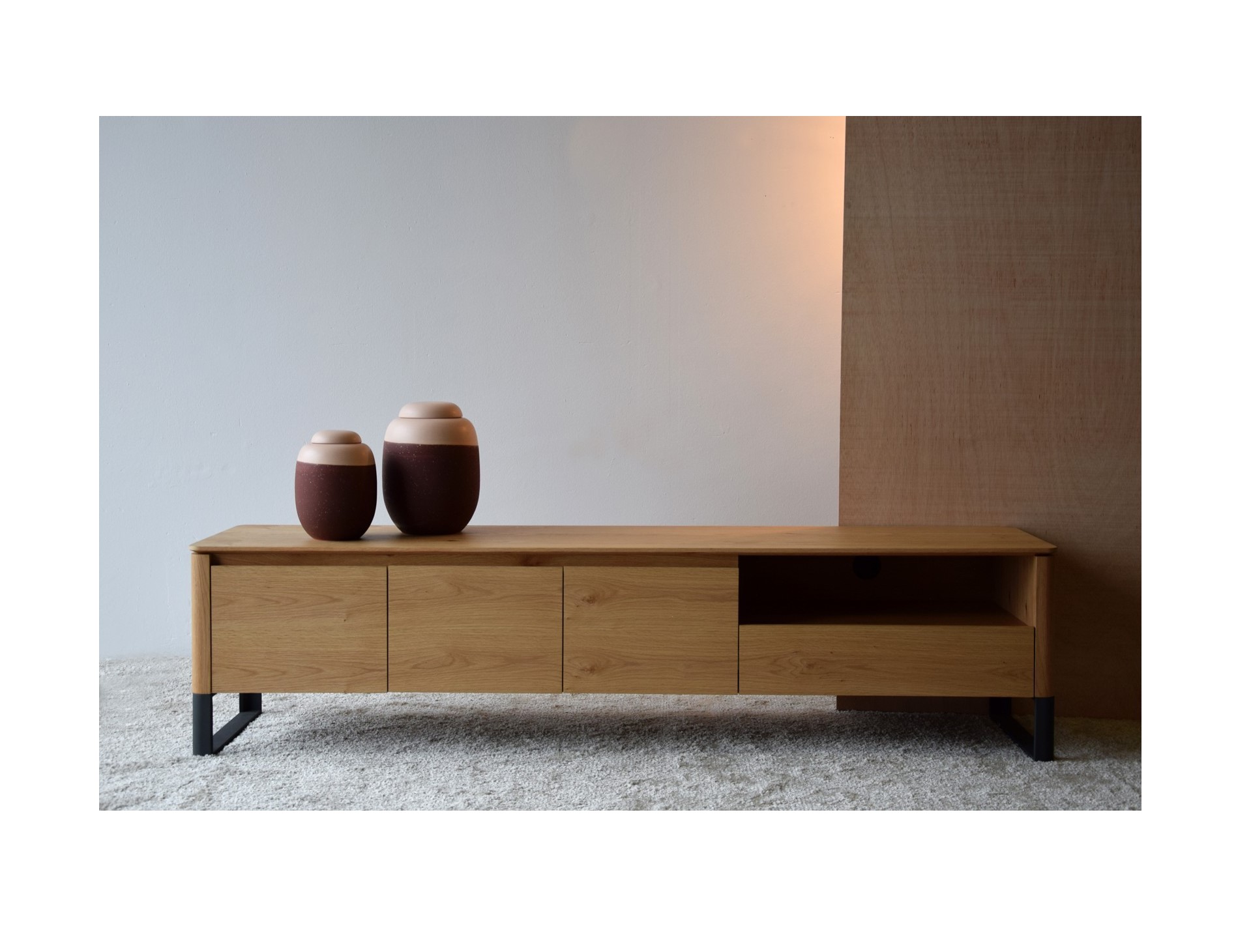 MUEBLE TV REALIZADO EN DM RECHAPADO EN MADERA DE ROBLE NATURAL MATE CON PATAS EN ACERO ACABADO GRAFITO MATE. CUENTA CON TRES PUERTAS Y UN CAJÓN. NO INCLUYE BALDAS INTERIORES.