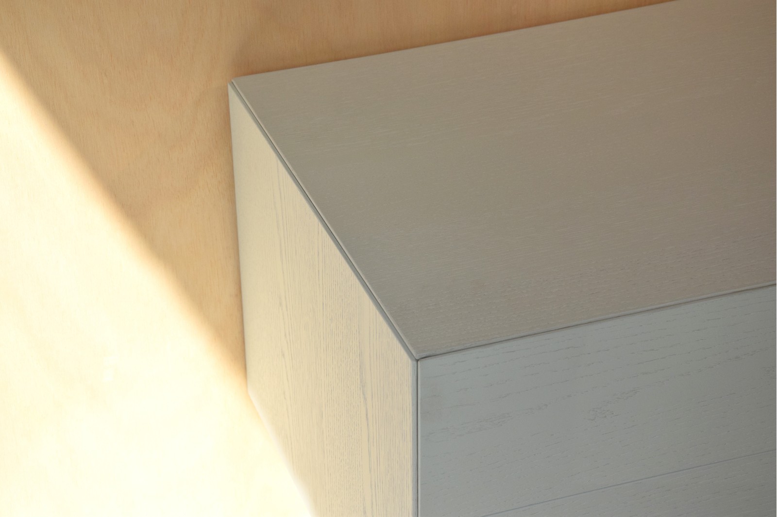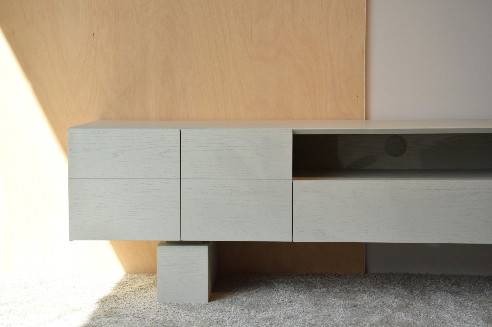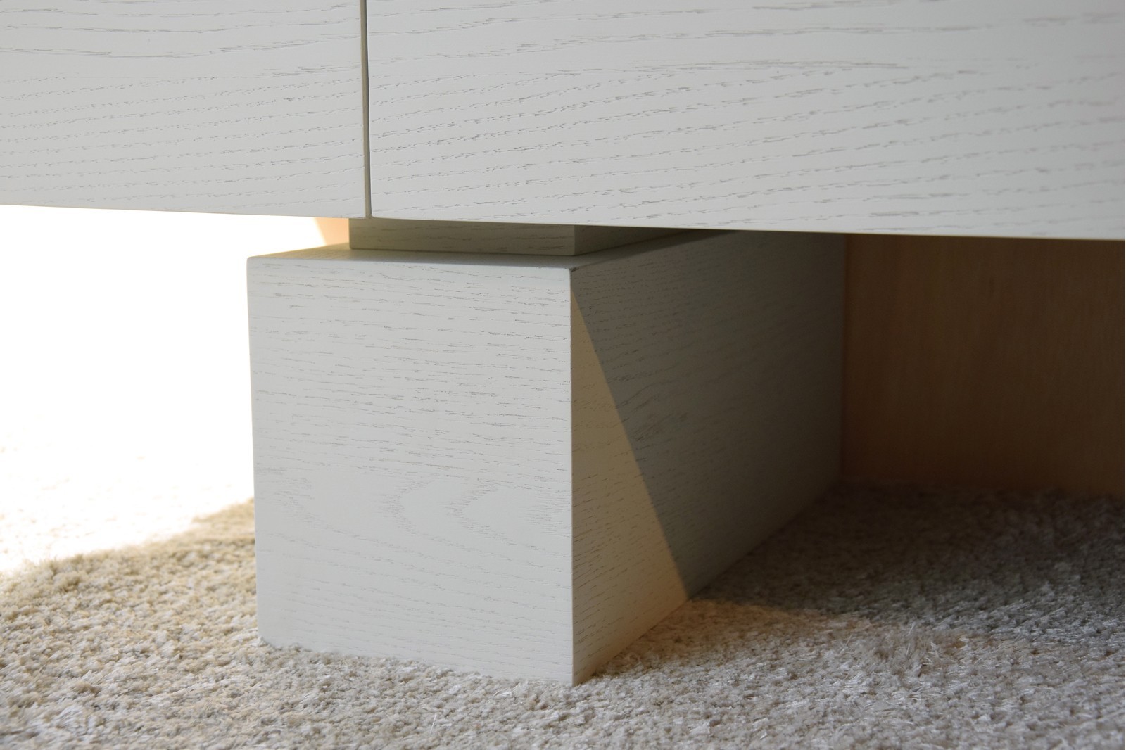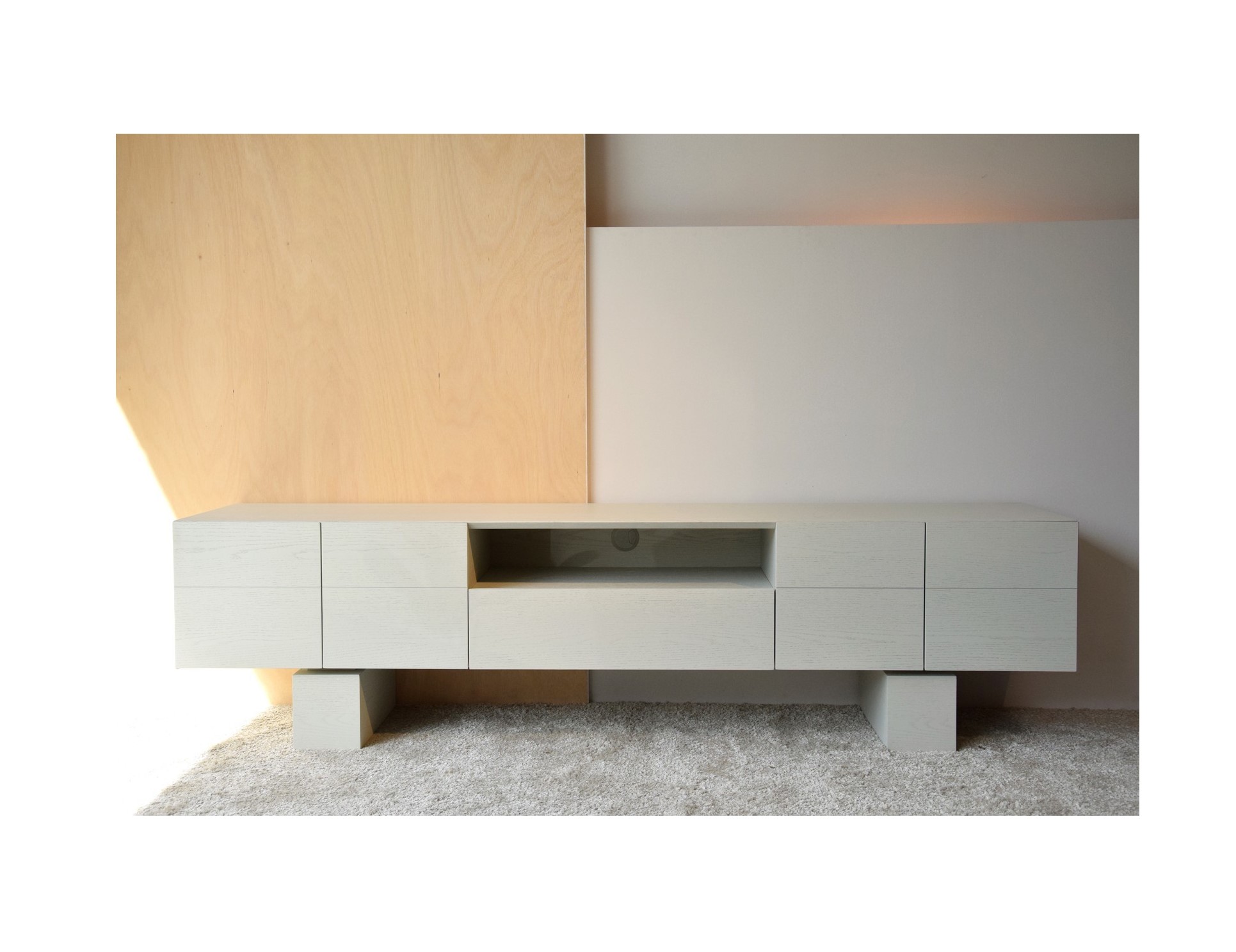 MUEBLE DE TELEVISIÓN REALIZADO EN DM RECHAPADO EN MADERA ROBLE NATURAL TEÑIDO EN UN TONO BLANCO ROTO MATE QUE DEJA A LA VISTA LA VETA NATURAL DE LA MADERA. CUENTA CON UN PRÁCTICO CAJÓN CENTRAL Y CUATRO PUERTAS. NO INCLUYE BALDAS INTERIORES