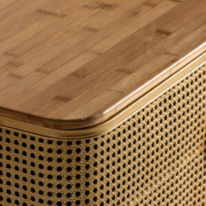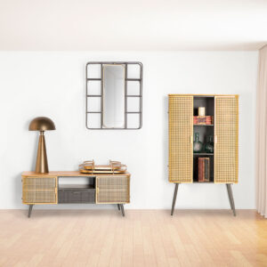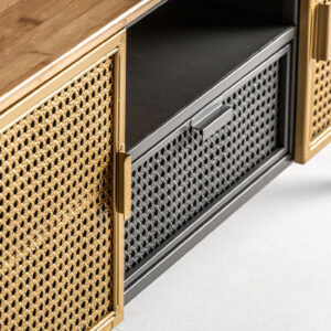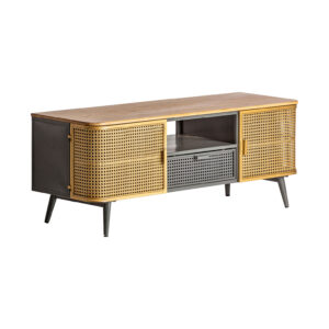 MUEBLE TV VARESE, EN COLOR GRIS/ORO, DE ESTILO INDUSTRIAL. FABRICADO EN HIERRO, COMBINADO CON BAMBÚ. PRODUCTO DESMONTABLE.