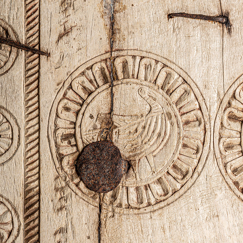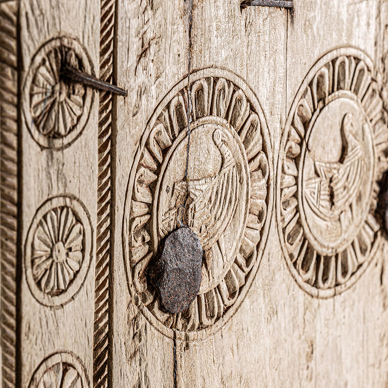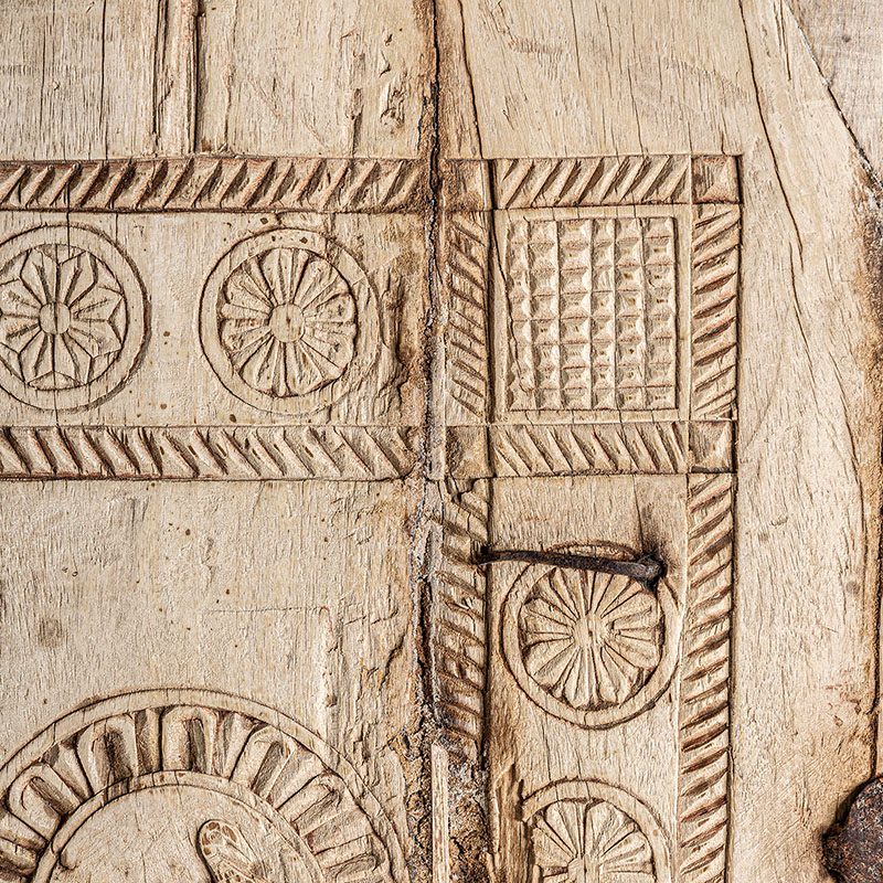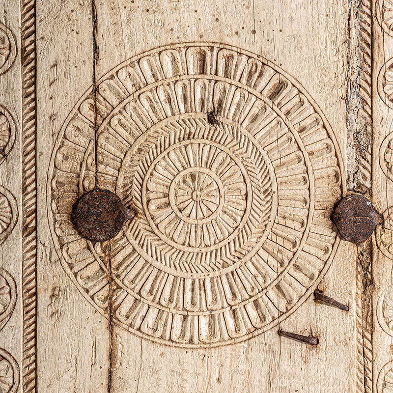Panel decorativo askale de estilo étnico fabricado en madera de teka en color marrón con acabado envejecido.