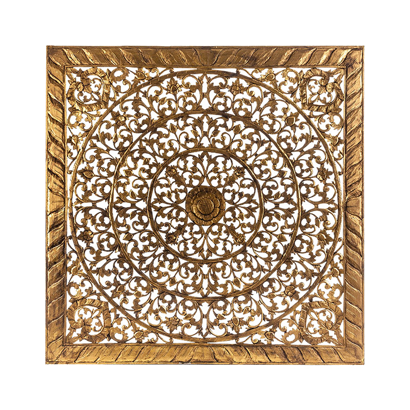 Panel decorativo cuadrado eleonora, en color dorado, de estilo oriental. Fabricado en madera dm.