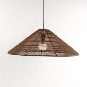 Pantalla de ratán sintético con forma cónica. Apta para uso exterior en jardín, porche o terraza. Pantalla de bambú sintético en color lino. Destaca por su forma, ratán tupido y gran tamaño . Es una lámpara para espacios amplios gracias a sus dimensiones. Perfecta para mesas redondas o cuadradas de gran tamaño.