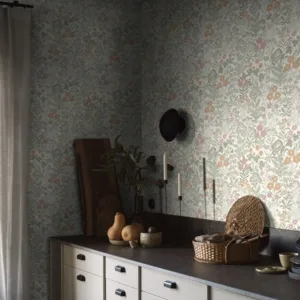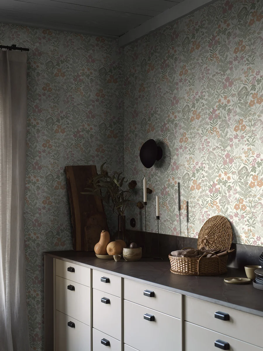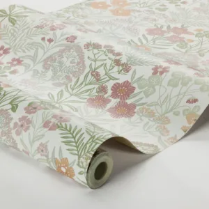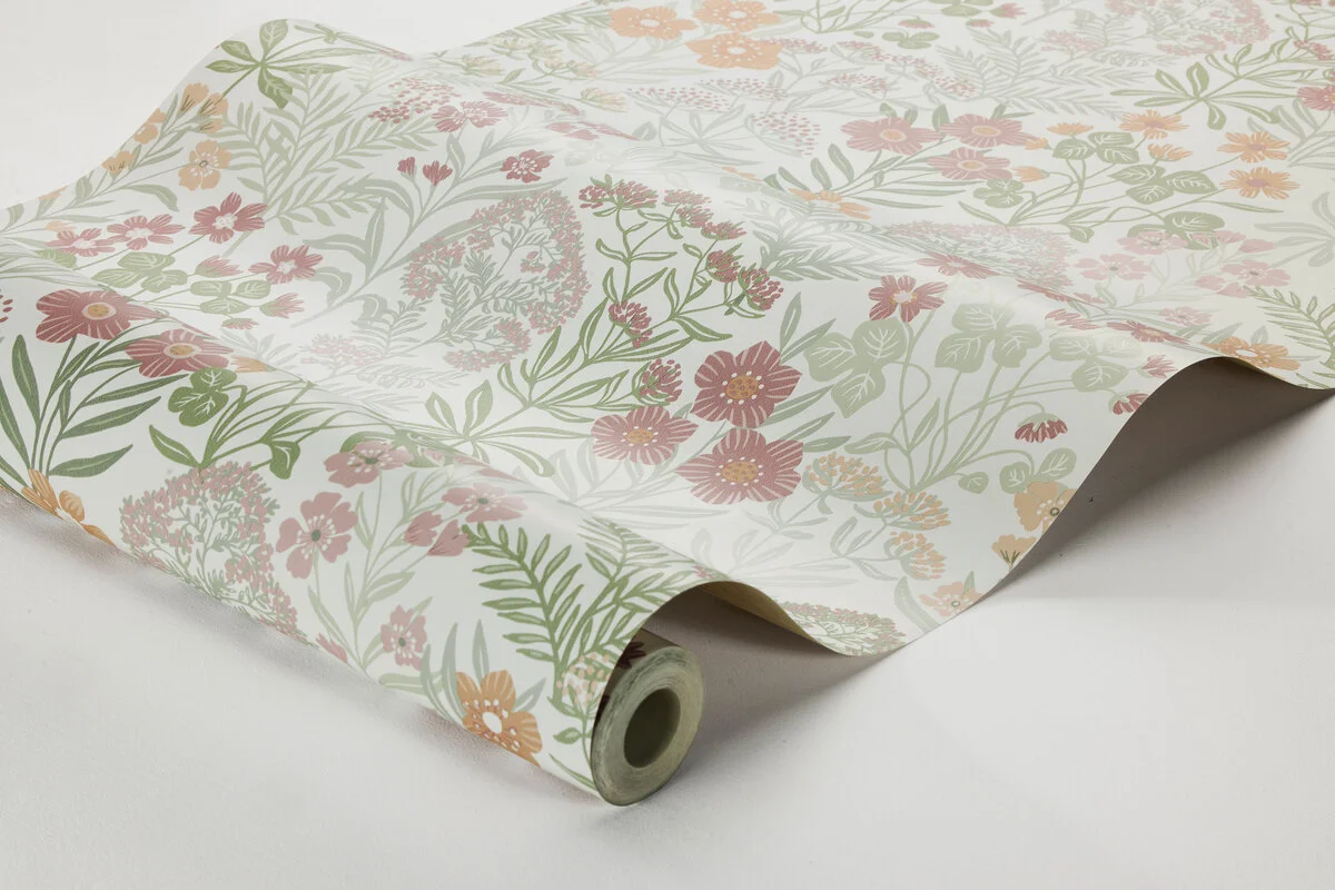 Nuestro papel pintado Äng, de un cálido blanco cremoso con una bonita paleta de tonos pastel de verde, rosa y naranja, te lleva a la belleza de la naturaleza y a los prados de ensueño de la Escandinavia rural. Respira el aire fresco y los deliciosos aromas florales desde la comodidad de tu sala de estar mientras te relajas y disfrutas del diseño de flores y follaje que visten y rejuvenecen tus paredes.