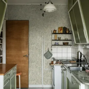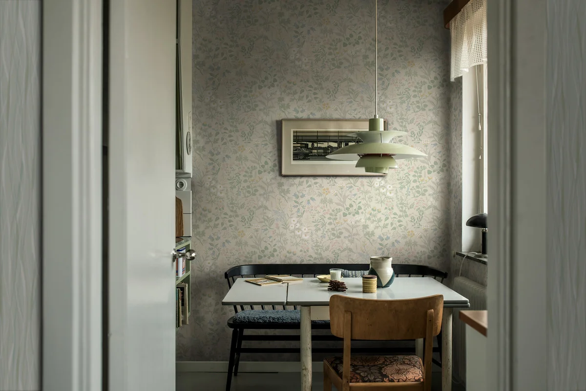 Con una bonita paleta de tonos pastel de verde, rosa, amarillo, blanco y azul, nuestro papel pintado Flora celebra las sublimes vistas y aromas de un prado primaveral sueco.