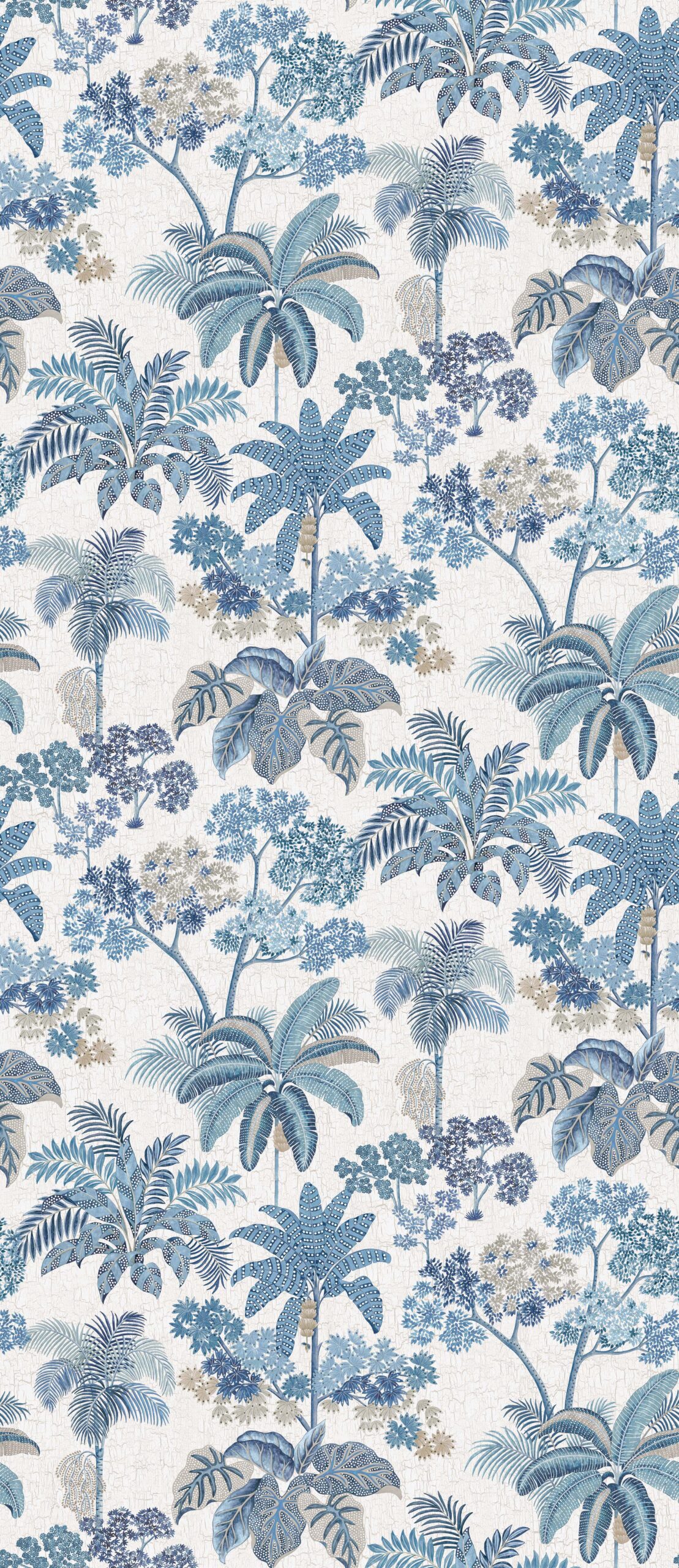 Un hermoso paisaje ajardinado de elegantes árboles, plátanos y palmeras datileras. El diseño ha sido pintado sobre un suelo craquelado, que recuerda a los antiguos frescos de las paredes.