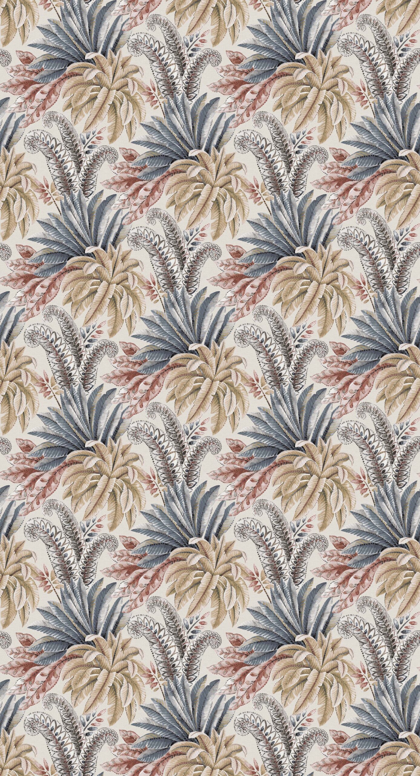 Un diseño extravagante con helechos y frondas de cachemira estilizadas está impreso sobre un fondo de lino en relieve. El nombre de un jardín en Nueva Zelanda.