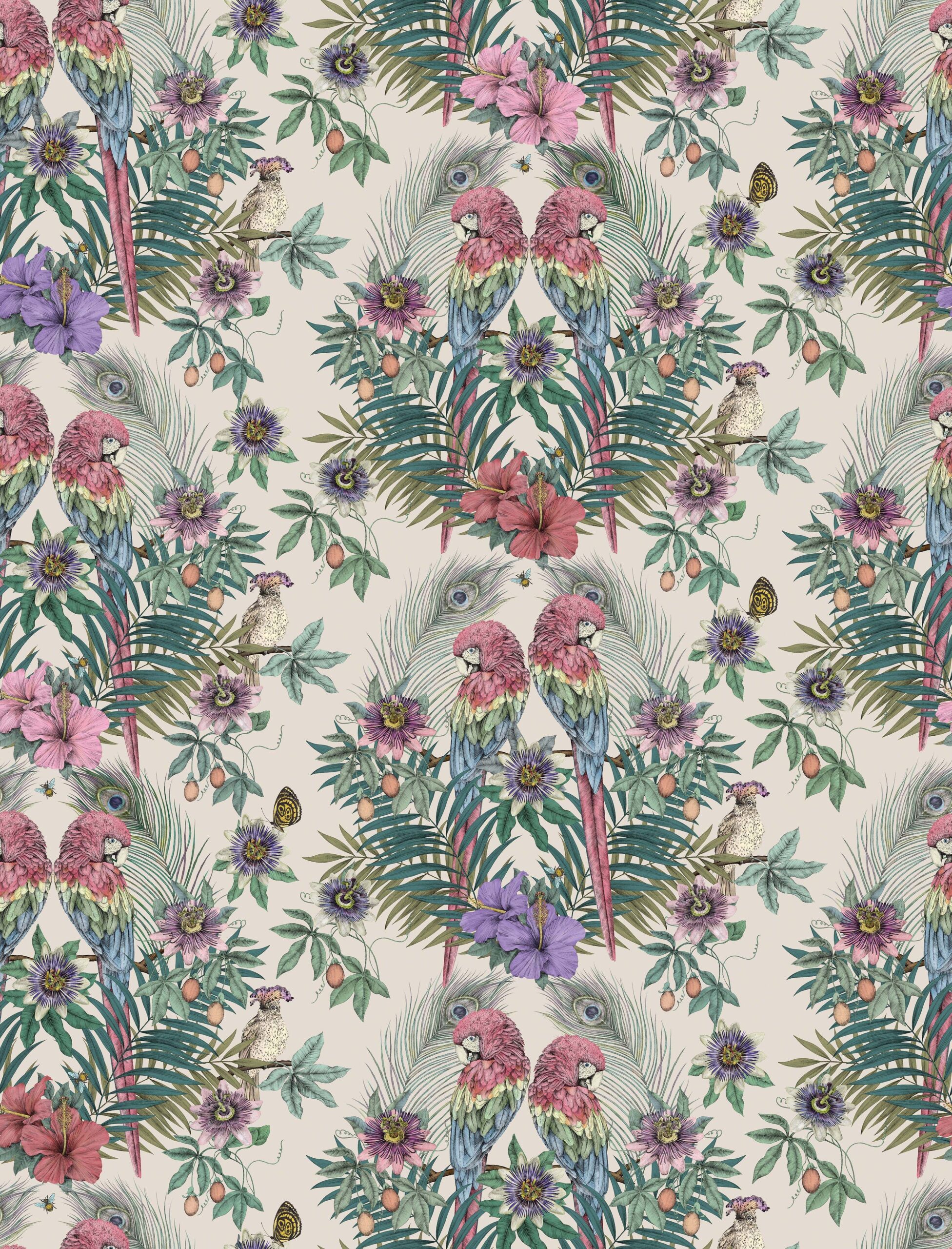 La flora y la fauna tropicales han sido durante mucho tiempo una fuente de inspiración clave para la marca Matthew Williamson. Ventura es la última encarnación de un oasis lúdico y caprichoso. Los loros pintados se posan en las palmeras con frutas exóticas, bayas y flores de la pasión en una repetición clásica.