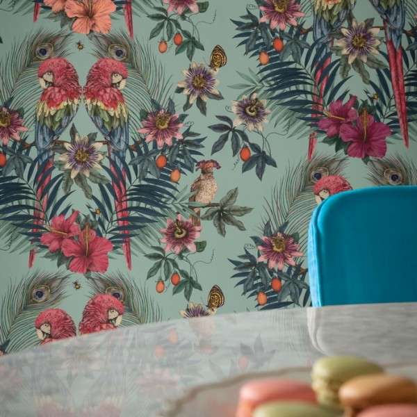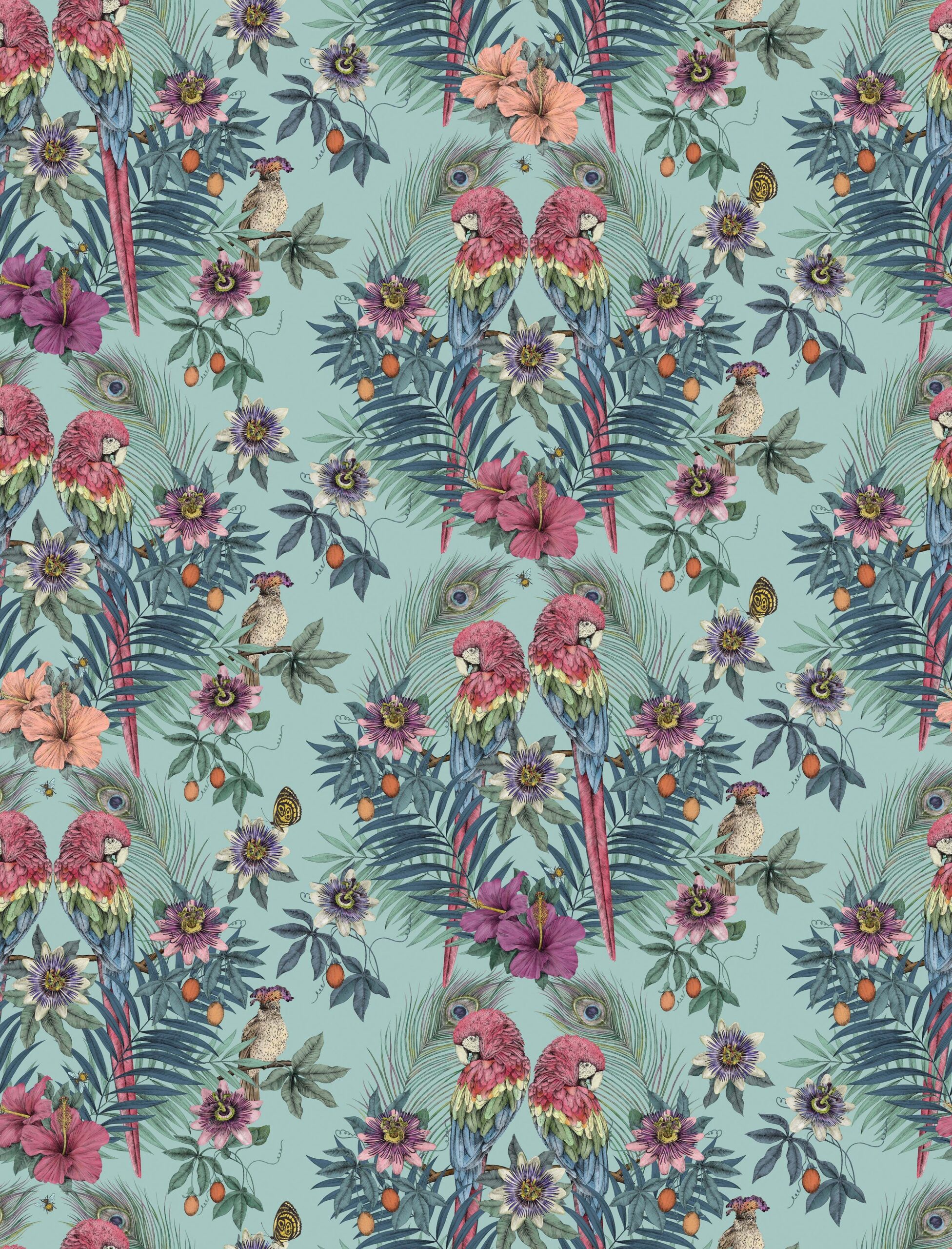 La flora y la fauna tropicales han sido durante mucho tiempo una fuente de inspiración clave para la marca Matthew Williamson. Ventura es la última encarnación de un oasis lúdico y caprichoso. Los loros pintados se posan en las palmeras con frutas exóticas, bayas y flores de la pasión en una repetición clásica.