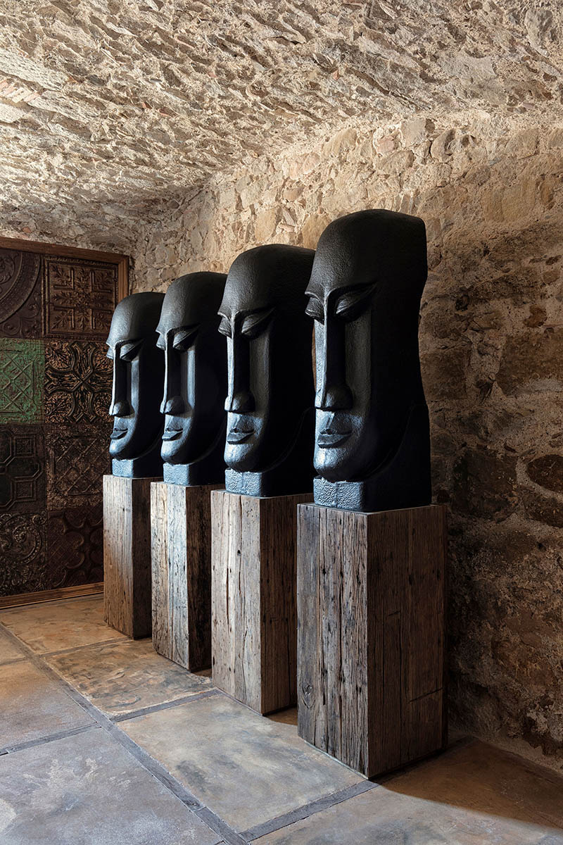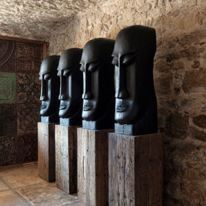 Peana Samsun de estilo étnico fabricado en madera de pino reciclado en color marrón con acabado envejecido combinado con mármol. Varias maderas: pino mango teka acacia. Producto desmontable.