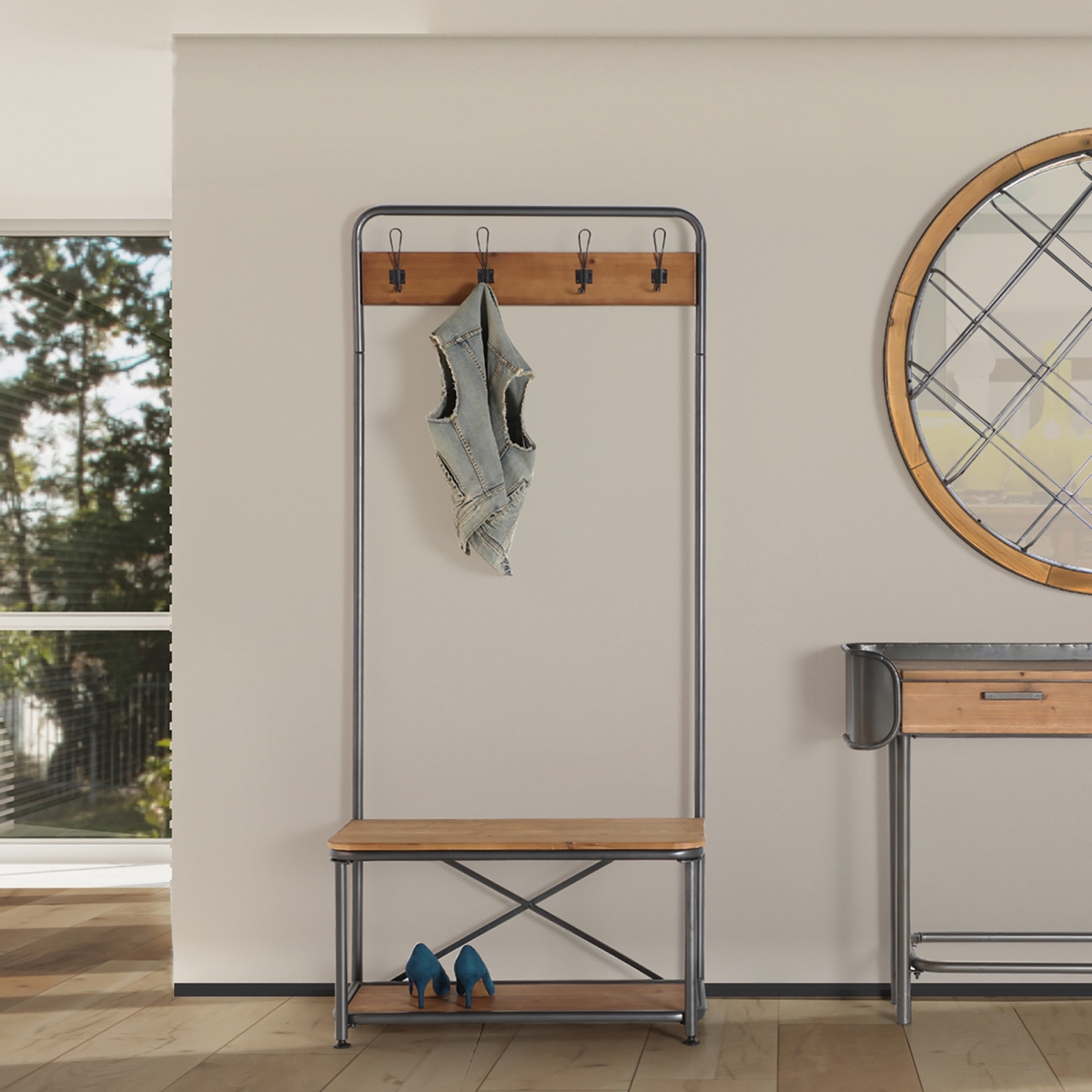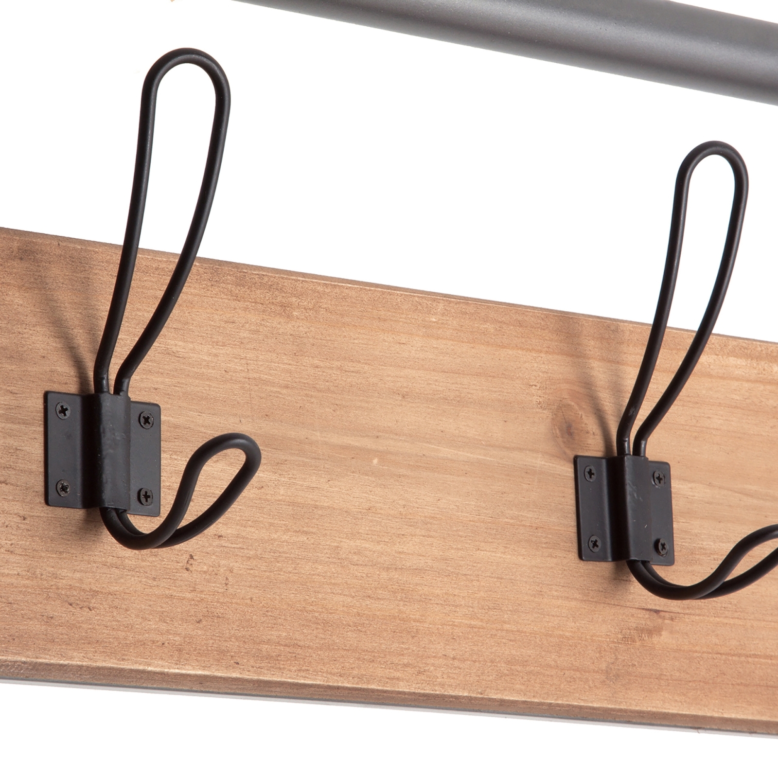 Perchero de estilo industrial elaborado en madera de abeto natural y hierro. Posee 2 estantes inferiores para almacenaje y 4 perchas en la parte superior. Gracias a su diseño versátil puede utilizarse en cualquier ambiente del hogar como el recibidor, la sala de estar, etc. Es un producto desmontable, lo que facilita su manejo y transporte.