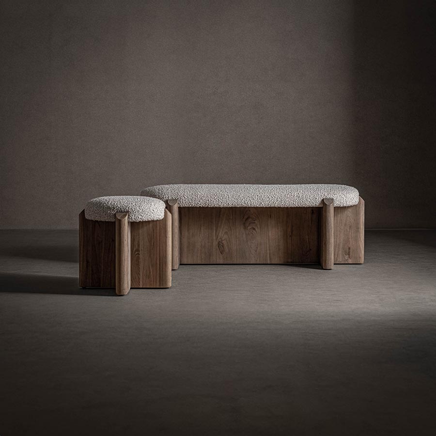Pie de cama Jacquard de estilo contemporáneo fabricado en madera de olmo en color marrón combinado con poliéster en color beige.