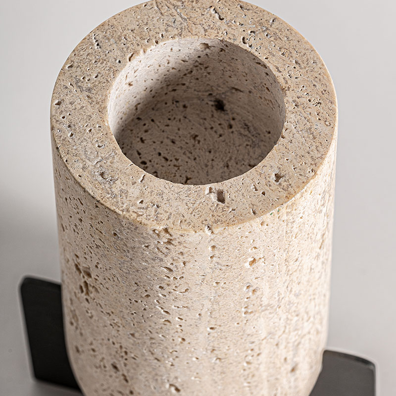 Portavela asher de estilo art deco fabricado en travertino en color beige combinado con hierro en color negro. Producto desmontable.