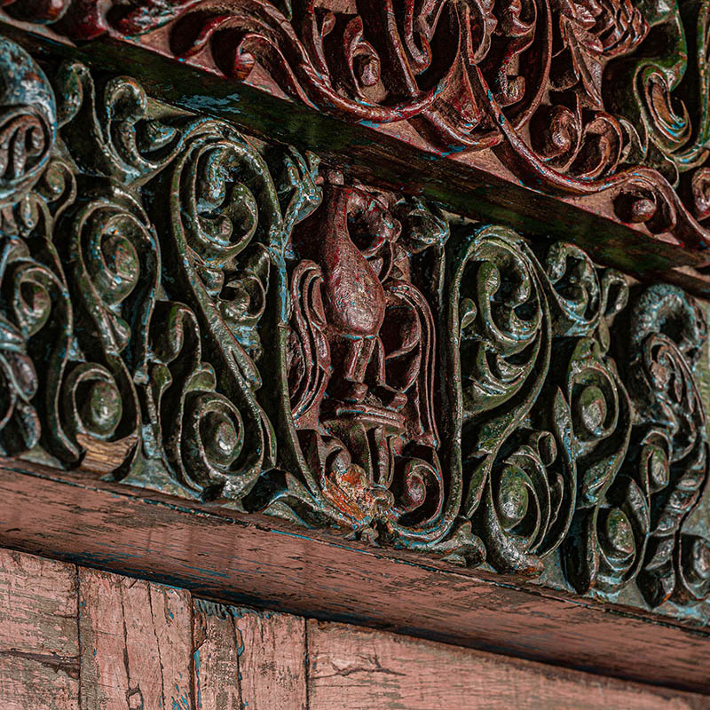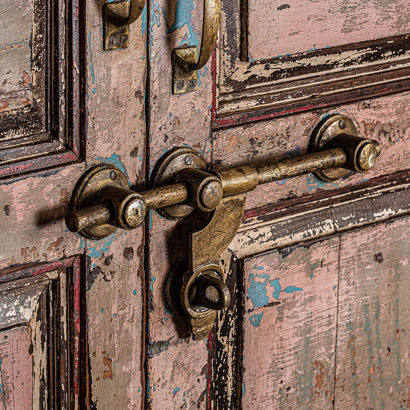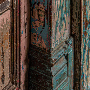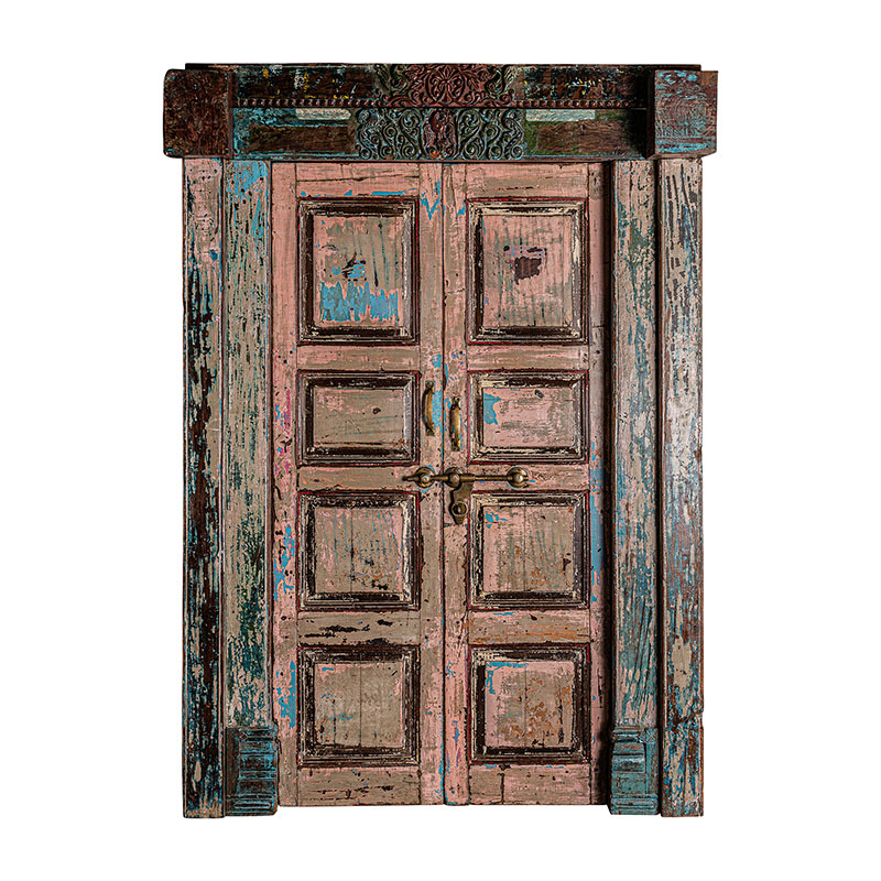 Puerta fanya, en color tonos de azul envejecido, de estilo étnico. Fabricado en madera de teka.