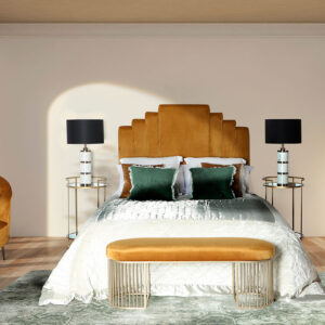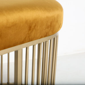 REPOSAPIÉS VALLANS, EN COLOR MOSTAZA, DE ESTILO ART DECO. FABRICADO EN TERCIOPELO, COMBINADO CON ACERO Y ESPUMA.