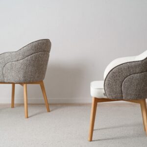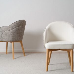 SET DE 2 SILLAS DE COMEDOR CON BRAZOS COLECCIÓN ROMA EN TONOS TOSTADOS Y MARFIL COMBINANDO UN TEJIDO CON TEXTURA EN LA PARTE EXTERIOR DEL RESPALDO EN COLORES MARRONES TOSTADOS Y MARFIL Y UN TEJIDO MAS SUAVE EN LA PATE INTERIOR Y ASIENTO EN COLOR MARFIL. ESTA SILLA DESTACA POR SU DISEÑO DE LÍNEAS SINUOSAS QUE SE ENFATIZAN CON LA COSTURA REALIZADA EN LA TRASERA QUE REPRODUCE LA LÍNEA CURVA MARCADA POR EL RESPALDO. SUS FORMAS SUAVES Y ENVOLVENTES INVITAN A TOMAR ASIENTO Y DIFRUTAR DE LARGAS SOBREMESAS. LAS PATAS ESTÁN REALIZADAS EN MADERA MACIZA DE ROBLE ACABADO NATURAL