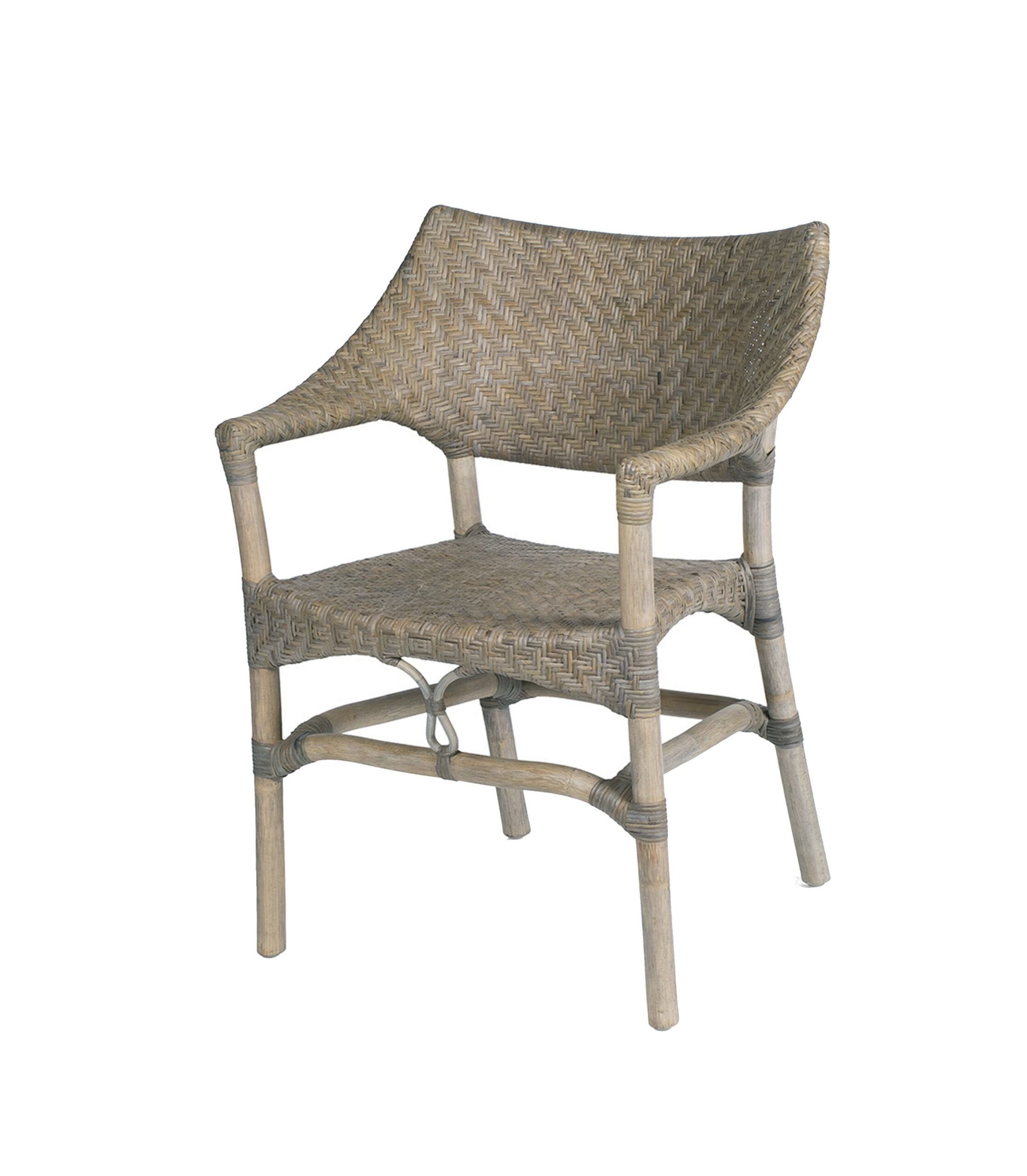 Altura asiento: 45 cm Altura brazos: 66 cms Medida del asiento: 46×46 cm Estructura manao. Asiento y respaldo en ratan. Color: marrón-grisaceo