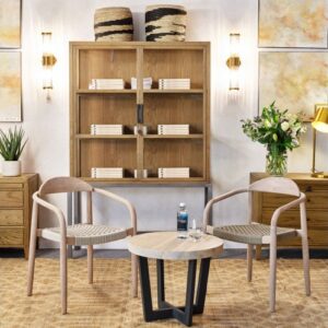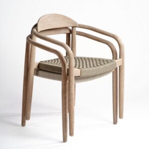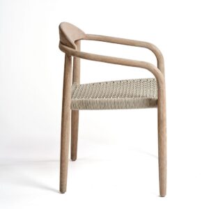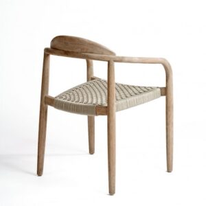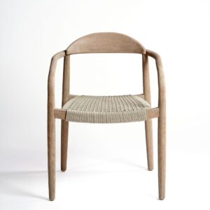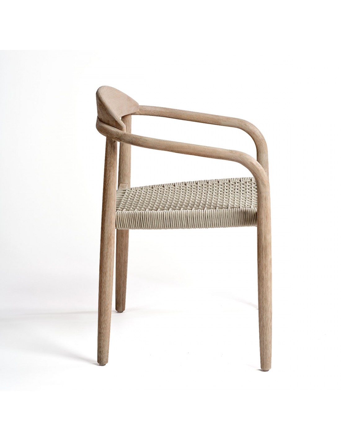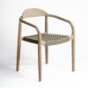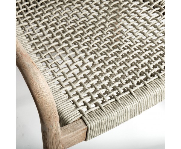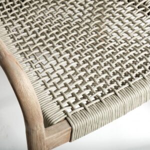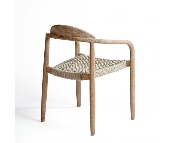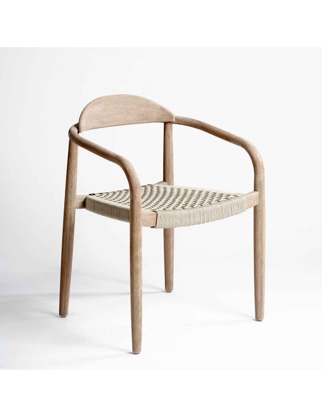 Silla de cuerda color gris claro y madera en tono claro. Sillón apilable apto para uso en exterior gracias a sus materiales. Fabricado en cuerda sintética y madera de eucalipto.