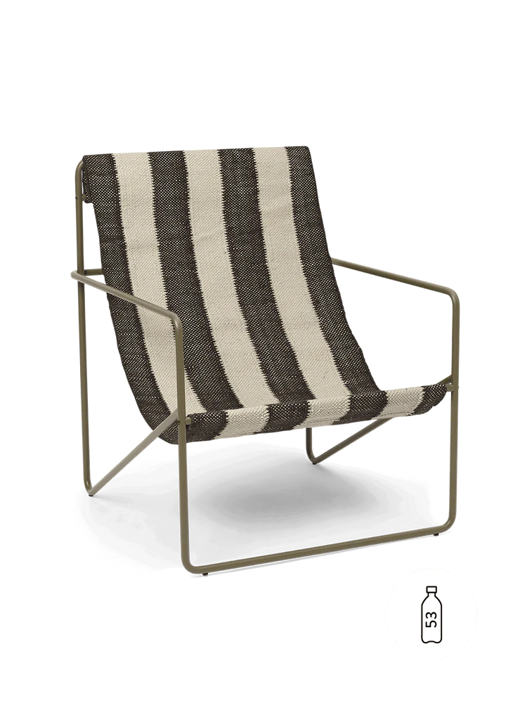 La silla Desert Lounge, una silla modernista con un perfil elegante, está confeccionada a partir de un marco tubular de acero con recubrimiento en polvo y sostiene un asiento textil intercambiable tejido a mano hecho enteramente de plástico reciclado posconsumo que se ha hilado en hilo PET. Adecuado para uso tanto en interiores como en exteriores, el diseño del salón invita a la relajación.