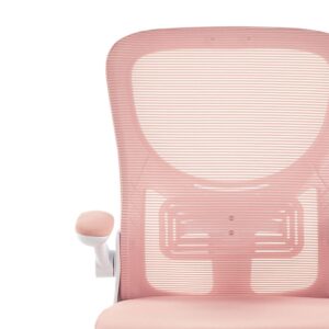 Asiento de poliéster y nylon color rosa con cojín fijo acolchado y respaldo ergonómico.