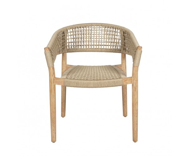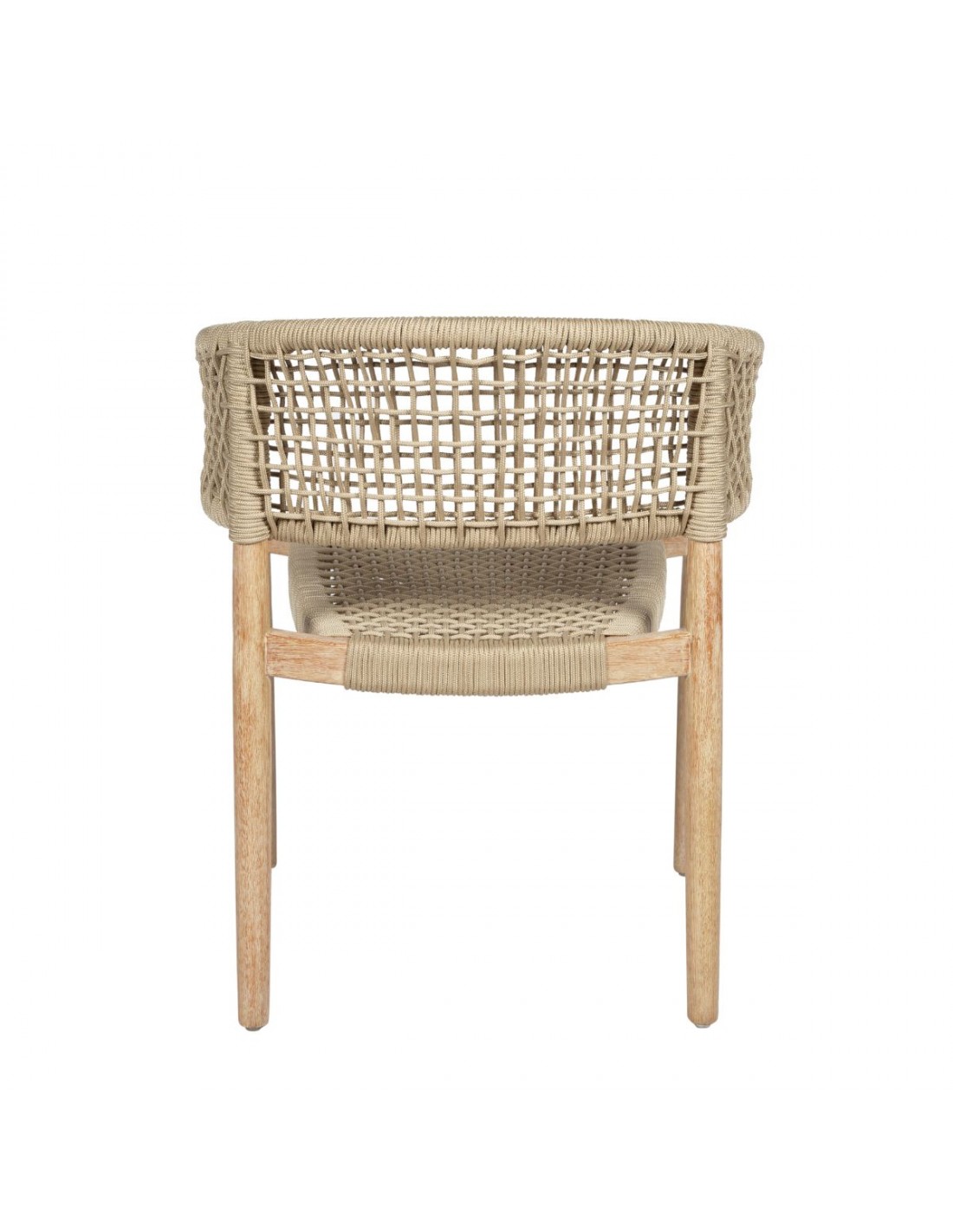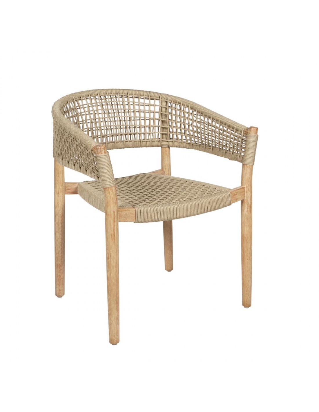 Silla para exterior de madera de eucalipto y cuerda color arena. Silla con respaldo redondeado. Es un modelo apilable perfecto para terrazas y porches al aire libre.
