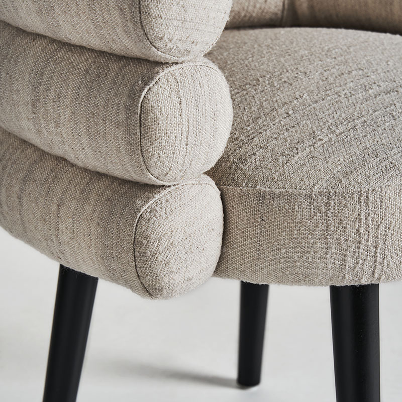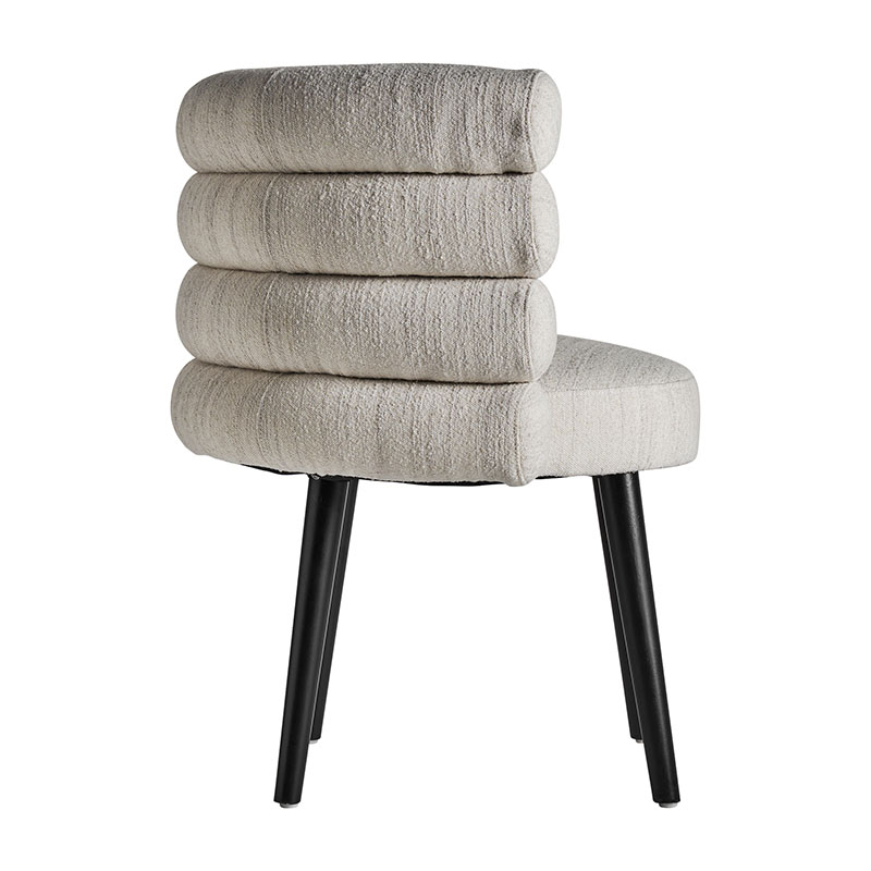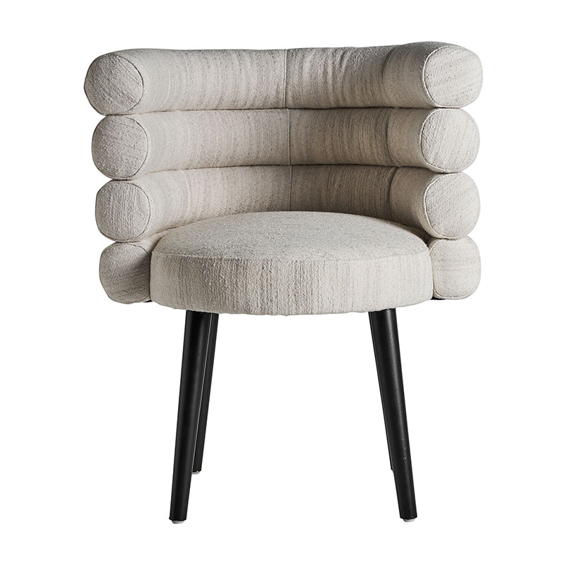 Silla finnoy, de estilo art deco. Fabricado en algodón, en color blanco roto, combinado con acero.