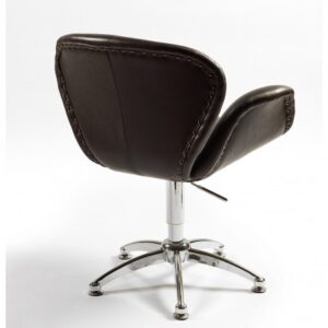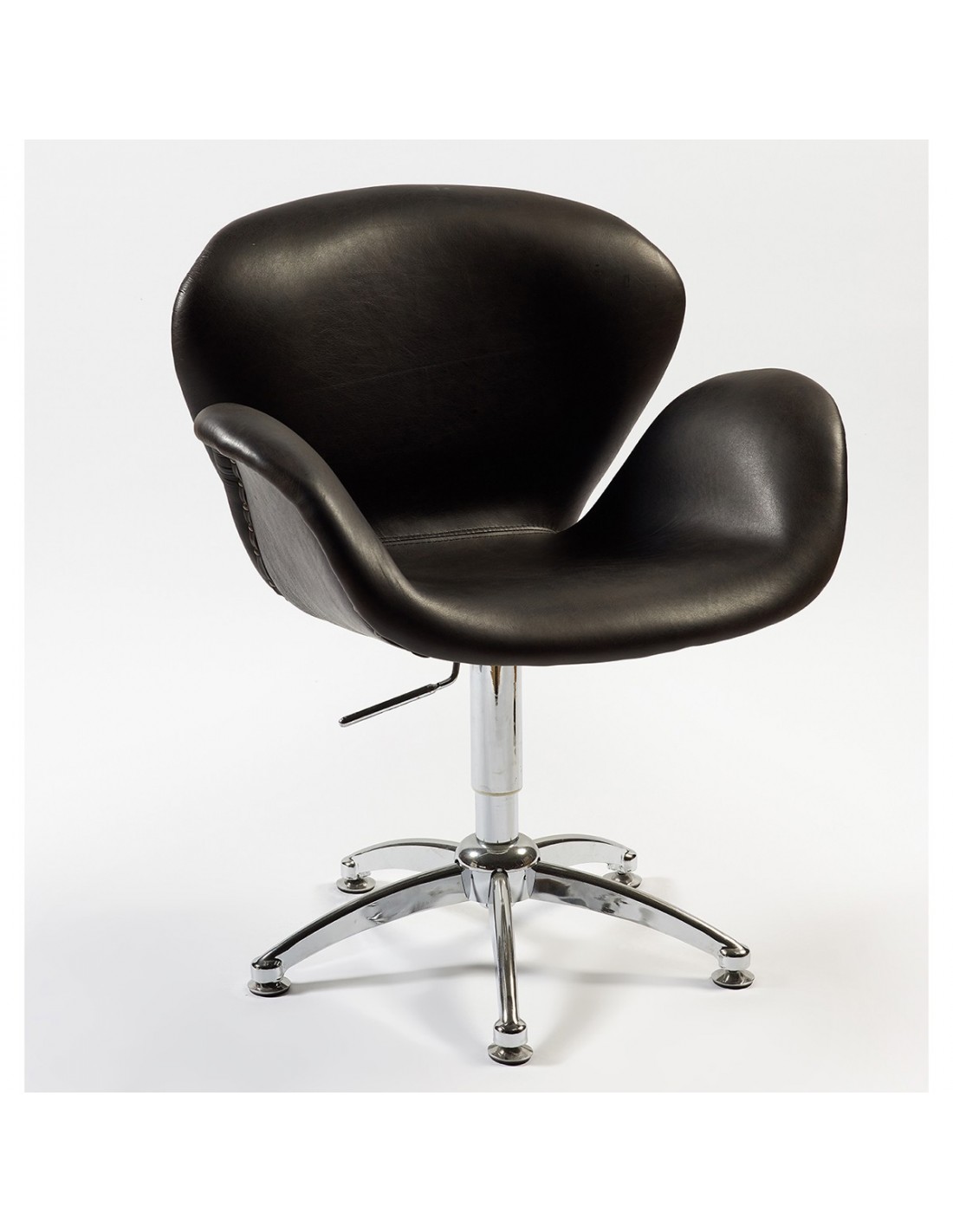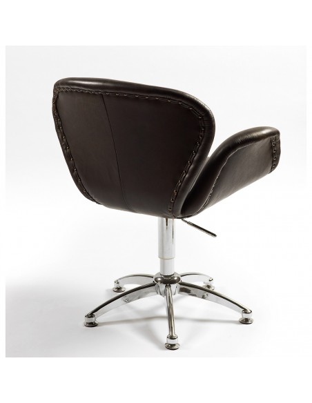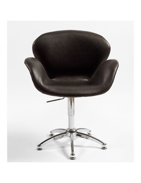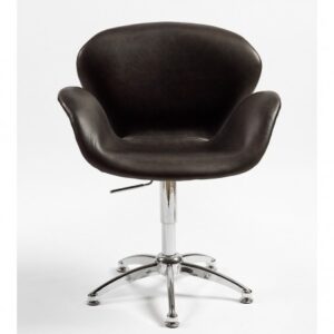 Silla giratoria de piel de vaca acabada en color negra. Se compone de una base de acero de color cromado con pata central. Este sillón presenta la combinación perfecta, con la parte trasera y bajera en aluminio cromado, convirtiéndose en un sillón moderno y contemporáneo. Este sillón encajará de maravilla tanto en el salón como en el dormitorio, que añadirá un toque de diseño. Elegante, confortable, envolvente y de línea acampanada hacen que resulte de lo más ideal.
