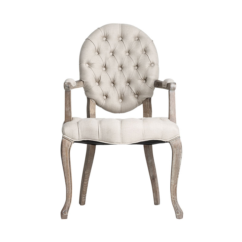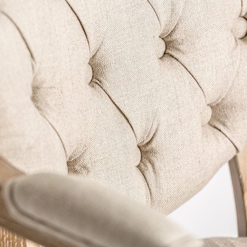 Silla capitoné jena, en color crema, de estilo colonial. Fabricado en lino, combinado con madera de fresno y espuma.
