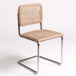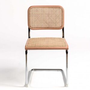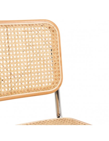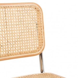 Silla de madera natural con asiento y respaldo de ratán natural y pata cromada. Original diseño con un estilo retro y toque cálido gracias a los materiales y colores naturales. La pata cromada le dan el punto característico. Un diseño visualmente ligero gracias a la forma de sus patas.