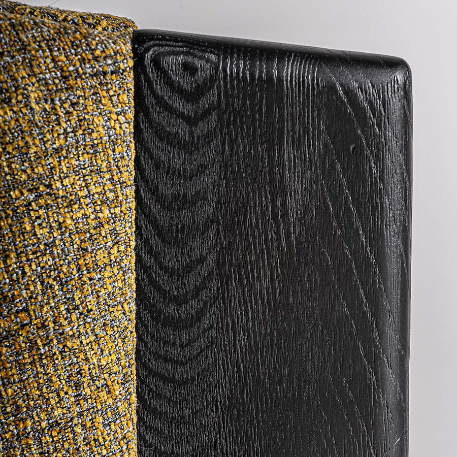 Silla nara de estilo contemporáneo fabricado en poliéster en color amarillo con acabado jaspeado combinado con madera roble en color negro.
